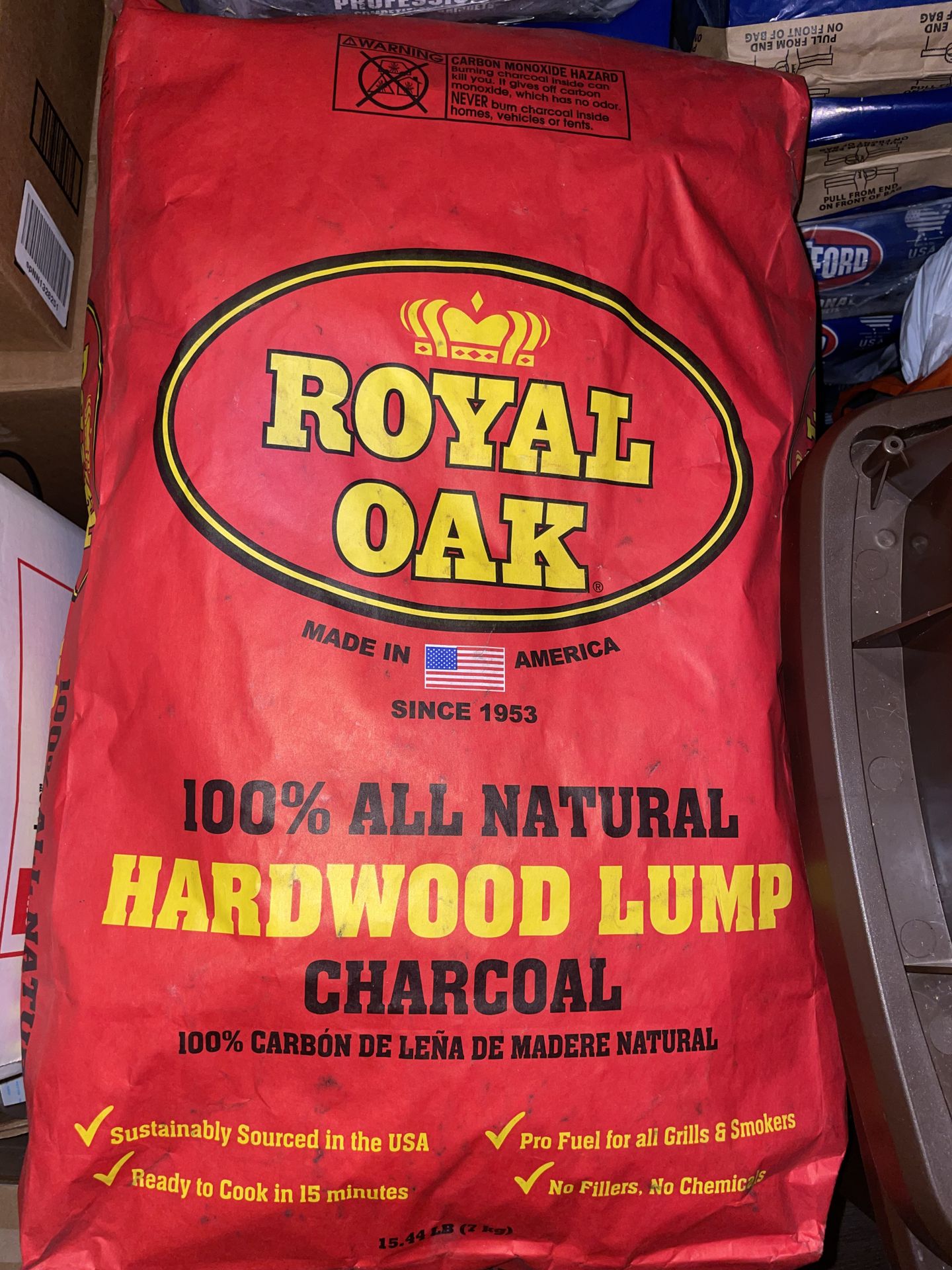 Price is firm. Priced per bag. You're in luck! It's still available! When you write, please let me know what day and time you would like to stop by between 11:30 a.m. and midnight -- and whether in my driveway in clear view of nine other houses, or the Wheaton Police Department vestibule. Because of massive data harvesting on this site, I do not text or make phone calls. I reply only to emails through this link and to no other. I do not reply to, "Is it still available" because that generally indicates spam. All natural! Royal Oak 100% Natural Hardwood Lump Charcoal gives your food that classic smoky, wood-fired BBQ flavor you know and love from the finest American Oak, Hickory Hardwood and nothing else. The natural lump charcoal lights easily, burns hotter, longer and cleaner for the best smoking and grilling experience. Perfect for grilling at high temperatures and for low and slow smoking at consistent temperatures. Works great in traditional charcoal grills, smokers and ceramic or non-ceramic grills. Highlights-- Classic BBQ flavor: get the authentic savory, smokey flavor that you love on beef, pork, chicken, seafood and vegetables; 100% all natural hardwood: from sustainably sourced oak and hickory hardwoods and nothing else since 1953; Burns long and hot: our lump charcoal lights quickly, gets to high temperatures for a great sear and is also perfect for low and slow smoking at consistent temperatures with little ash; Trusted by BBQ pros: use the same lump charcoal trusted by the best BBQ pitmasters across the USA pro fuel for traditional charcoal grills, smokers and ceramic or non-ceramic grills; and Lights fast: lights quickly and is ready to cook within 15-minutes light with a charcoal starter or all natural Royal Oak tumbleweeds. New stock just purchased has been kept in a temperature-controlled, non-smoking, low humidity, indoor environment, and out of sunlight. Sells at Home Depot for $17.97 per bag plus sales tax totaling $19.54. Why pay full price? Buy here and save big! Buy one or buy all five bags! Priced per bag.