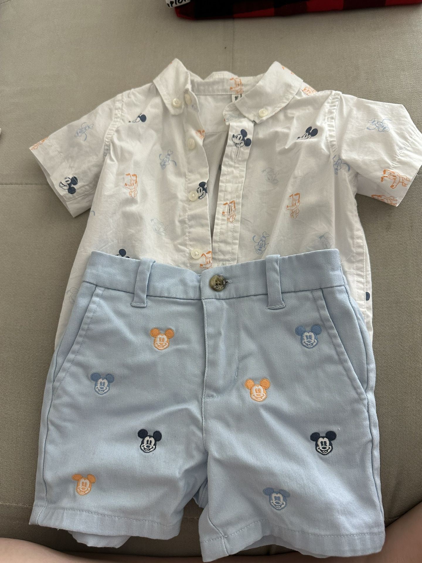 From Bloomingdales Disney x Janie & Jack Mickey Design Button up shirt + shorts Adorable design. Washed, but never worn 12-18 months