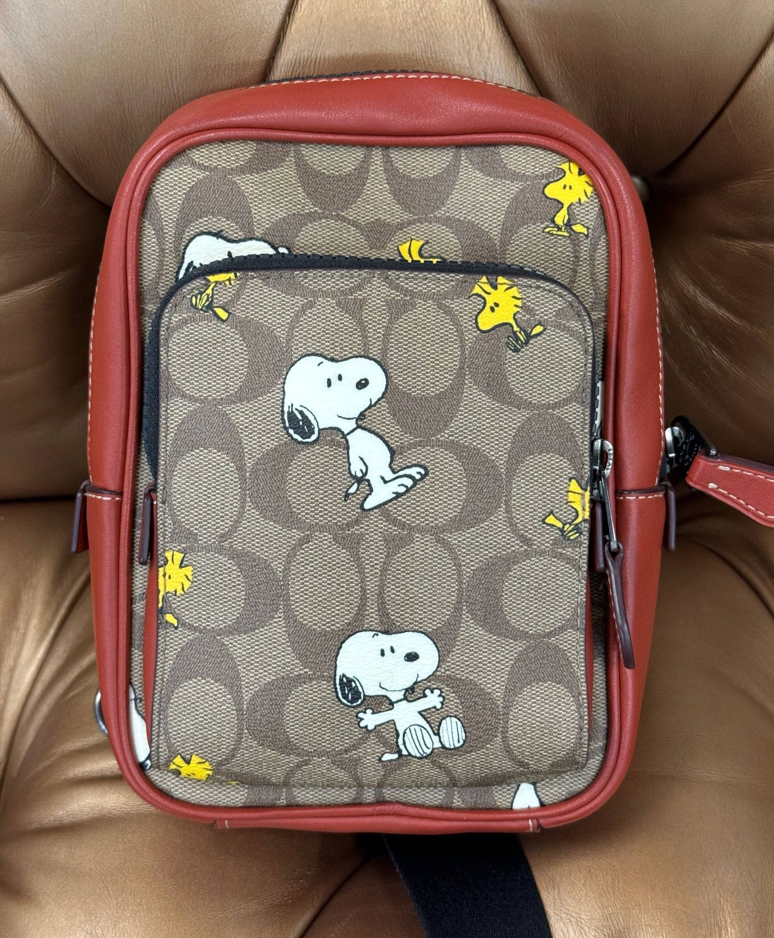 Coach x Peanuts Unisex Track Pack 14" in Signature Canvas with Snoopy & Woodstock Playful meets iconic in this limited-edition Coach x Peanuts collaboration. Crafted in Coach’s Signature canvas with refined leather details, this unisex Track Pack 14" features beloved Peanuts characters Snoopy and Woodstock for a nostalgic, lighthearted twist on a classic silhouette. Designed for modern versatility, the compact size makes it perfect for daily adventures, festivals, or weekend getaways. It features multiple zip compartments for effortless organization, an adjustable strap for crossbody or shoulder wear, and a bold yet timeless look that blends fashion with fun.