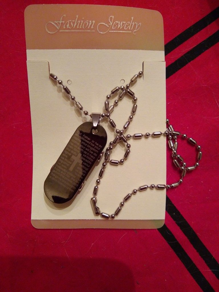 Stainless Steel, Lord's Prayer Skateboard Necklaces, with Spanish or English and choice of blue or pewter, 12 available,24.00 ea. or good offer-