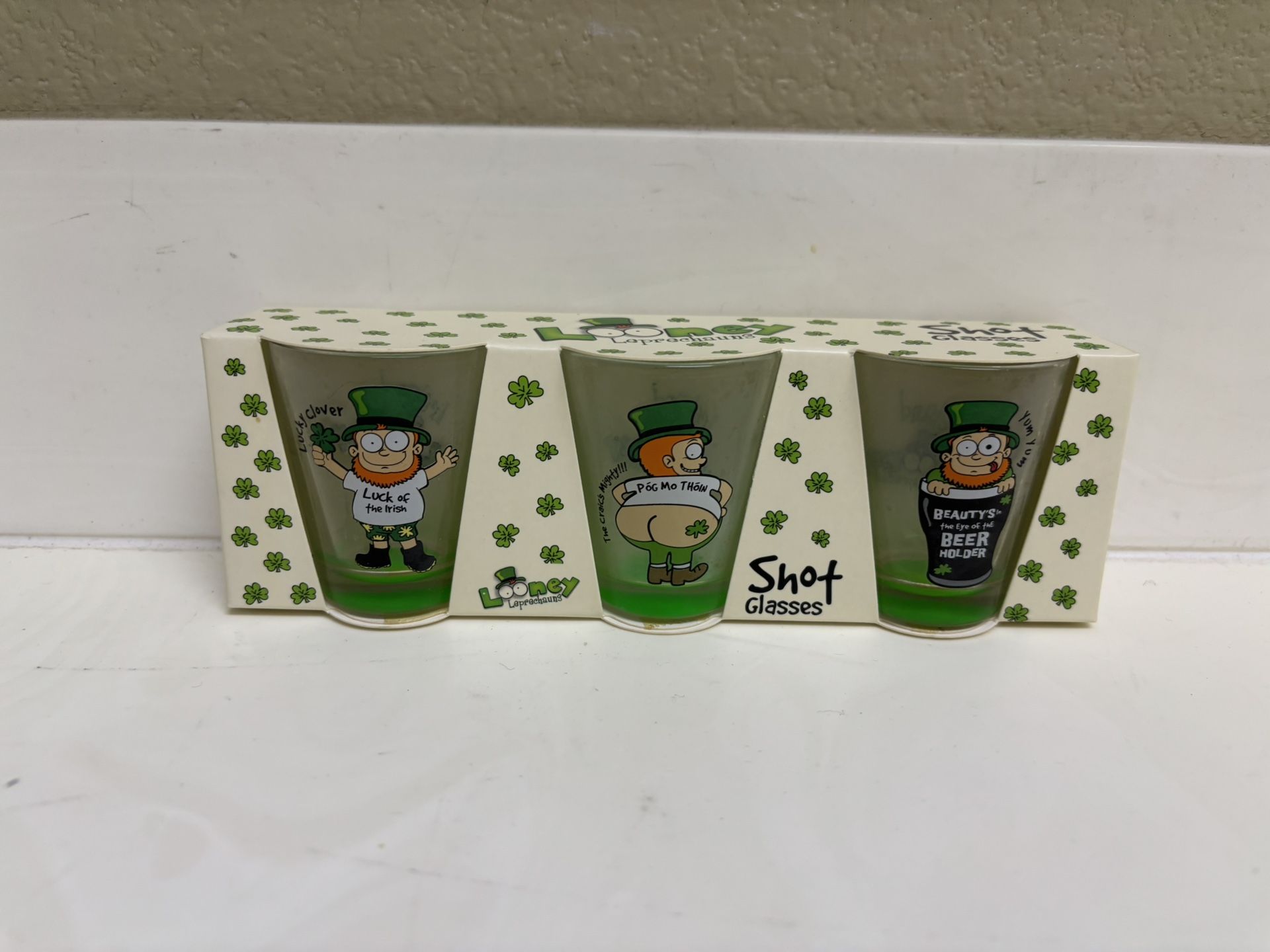 Brand new Set of 3 Looney Leprechaun shot glasses with humorous designs. Check out my other items to bundle