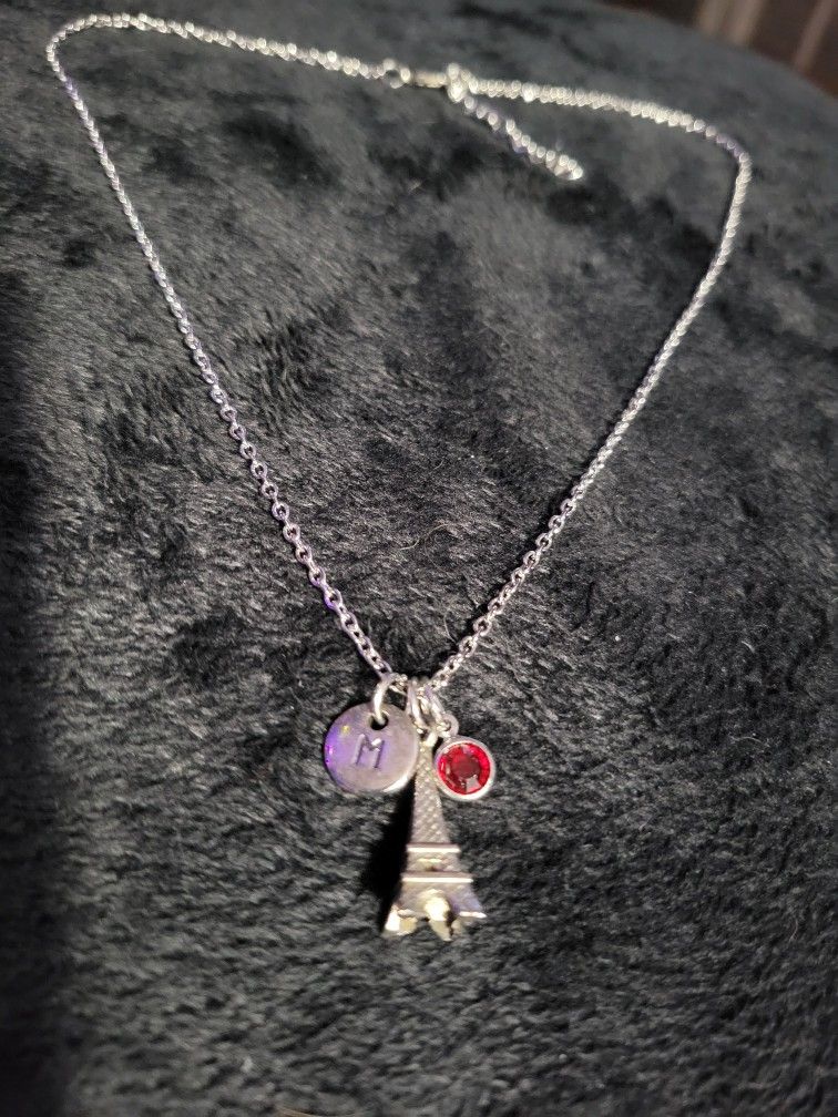 Eiffel Tower Charm Necklace. Necklace contains Eiffel Tower charm circle with letter m and red circle charm. Lobster Claw. 18-inch chain with 2-in extender. # 5