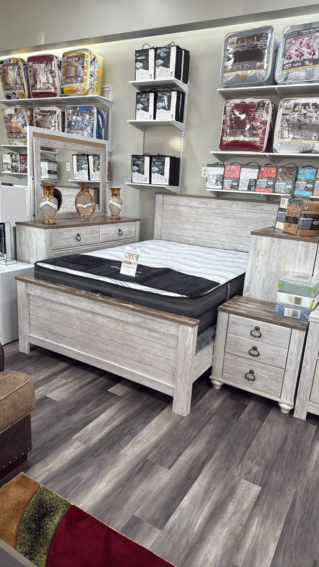 Includes, Headboard, Footboard, Rails, Dresser, Mirror, Nightstand, Mattress, Box Spring, 7 Piece Comforter Set, 6 Piece Sheet Set and 2 Pillows.