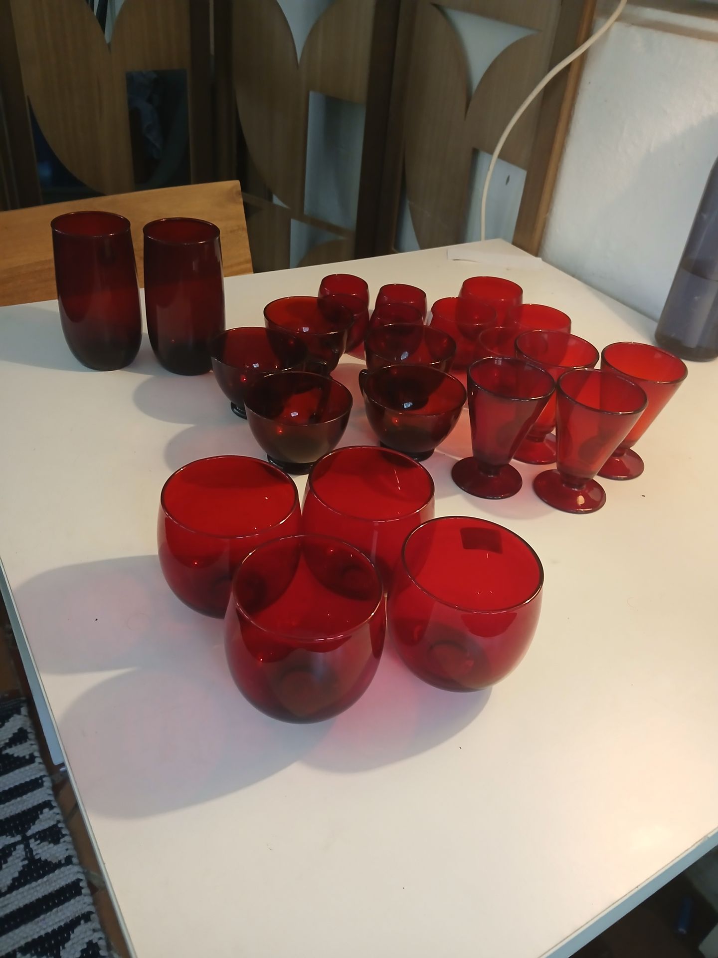 1930s Anchor Hocking Royal Ruby Red Glass Set 21 Piece. Tea, Wine, "Rolly Polly"