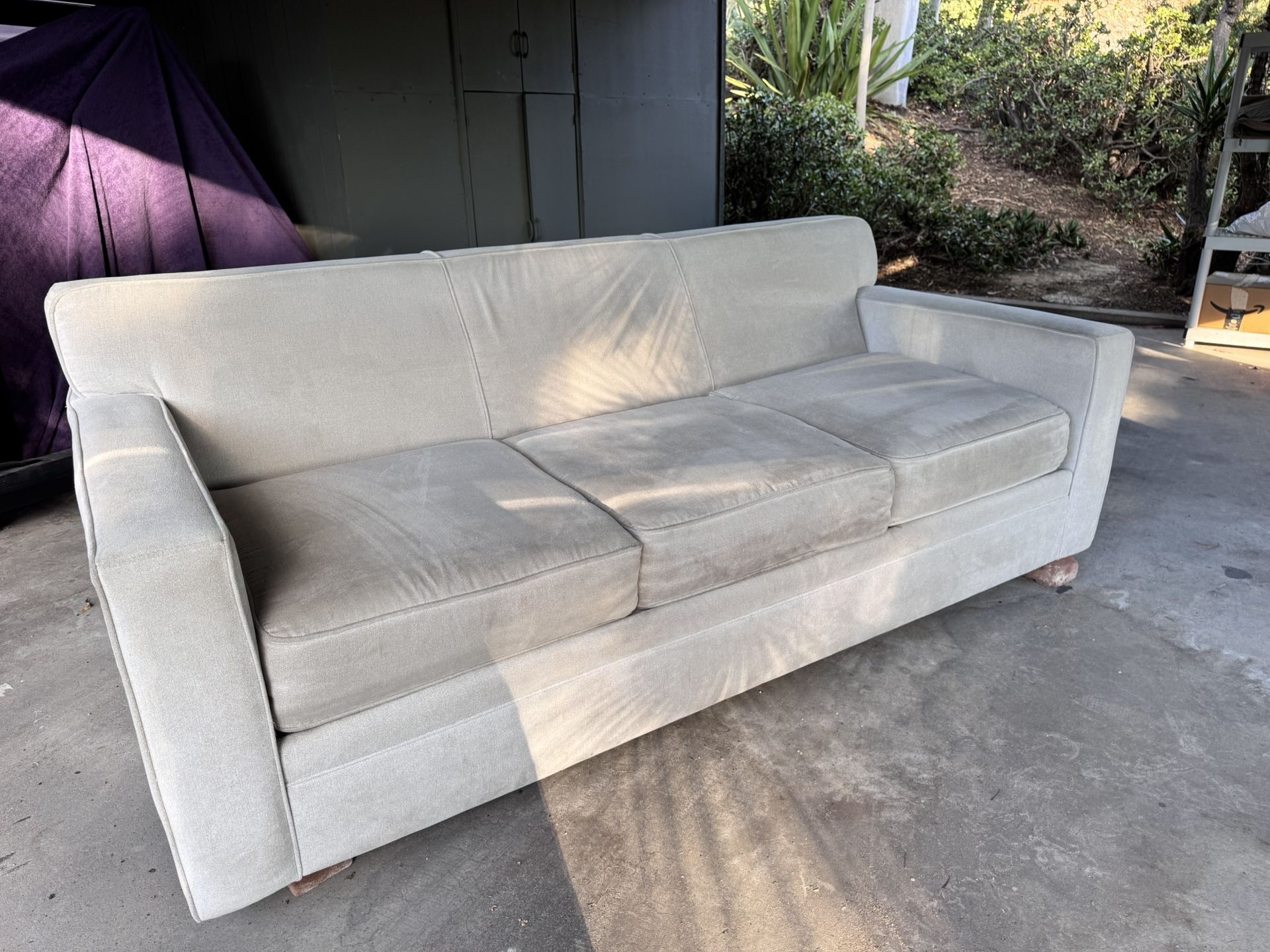 This couch is in great shape, just doesn’t fit in our home anymore. Cream/ ivory/ very light beige in color, there are only a few little stains and imperfections that are barely noticeable. Photos are taken in our carport where we just moved it out of our house, but it has been a well cared for indoor sofa in a no pets/ no smoking home. Folds out to a queen size bed. We always supplemented the mattress with a thin foam topper, and all our guests said it was very comfortable. Happy to throw in the topper if you like. Sofa comes with 4 solid wood feet that we took off to more easily move it through doorways. They easily screw right back on the bottom. We are located off of Montezuma near SDSU. Pick up only - we are not able to help with moving or delivery. It is heavy. Will respond promptly to all inquiries, except “ is the sofa still available?” If this is posted, it is available. Price is firm. Dimensions: 82.5” wide and 37” deep