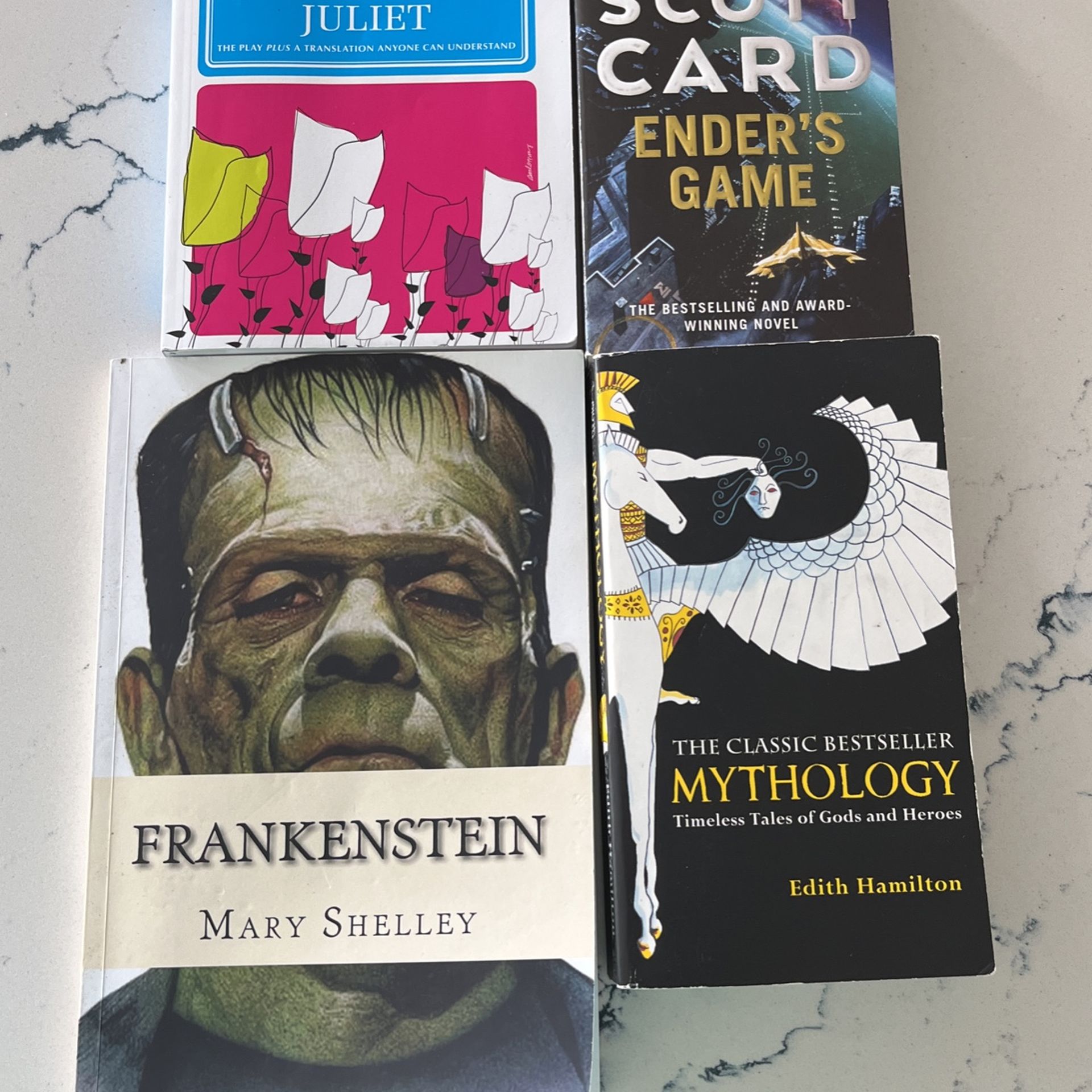 Selling them individually as well. Enders Game (Orson Scott Card)-$10.00 Mythology(Edith Hamilton)-$10.00 Shakespeare Romeo and Juliet (With Translation)-$5.00 Frankenstein (Mary Shelley)-$10.00