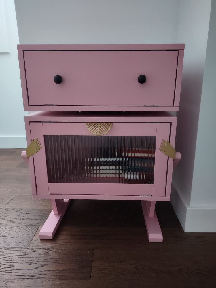 Super cute storage console with two compartments. Perfect height for use as a bedside table. Lower part has LED light strip with remote control. Color: pink. Condition: New in box. It comes in the original box, flat packed, ready to be built. It is easy to build, should only take about an hour and you need a screwdriver. I bought two but only ended up using one. Reasonable offers welcome!
