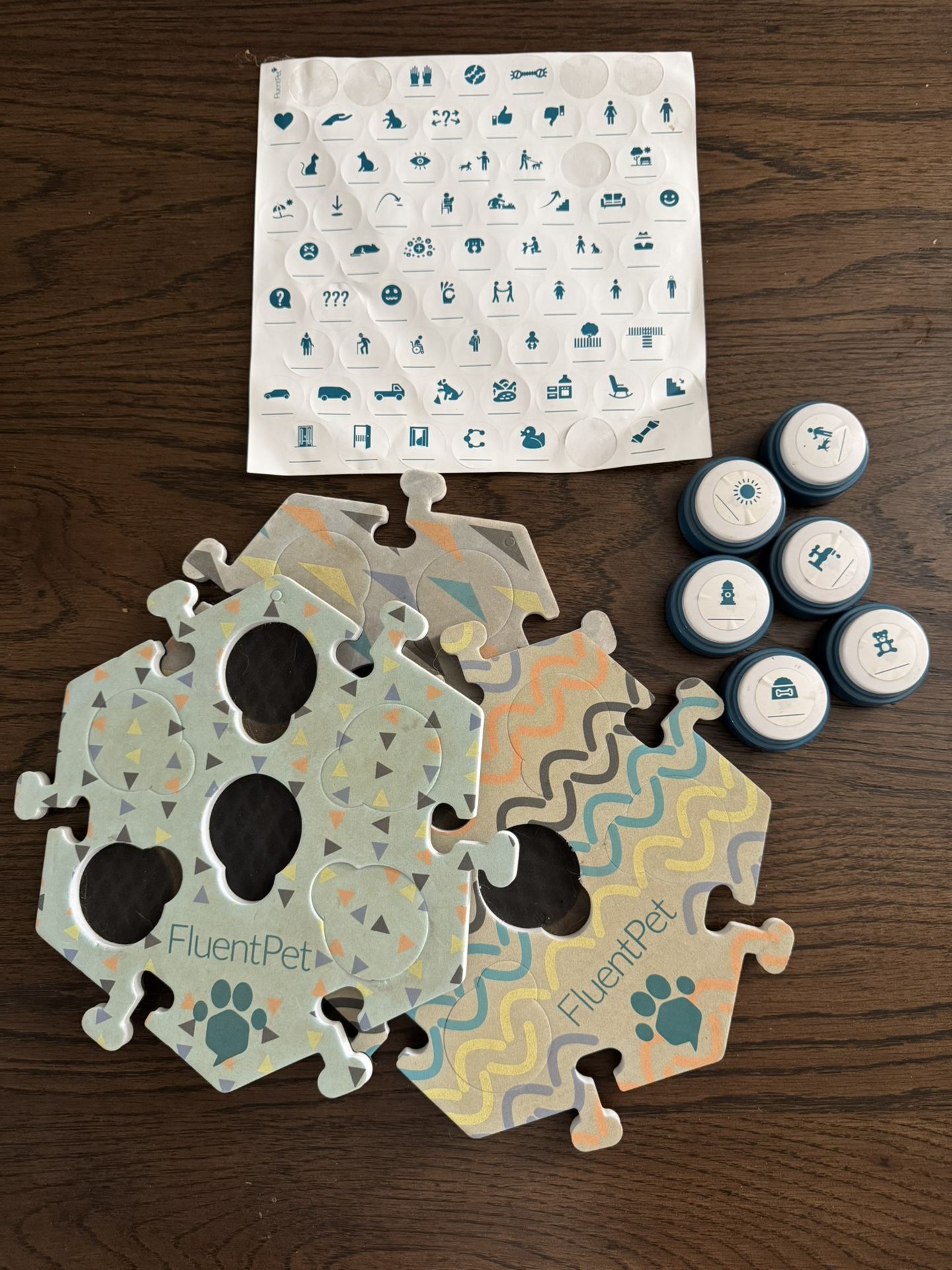 Dog and cat communication buttons. Fluent Pet starter kit- includes 6 recordable buttons and 3 hextile button mats as well as button sticker page to customize buttons to your dogs communication needs. Buttons need new batteries but still work great. My dog never took to it.