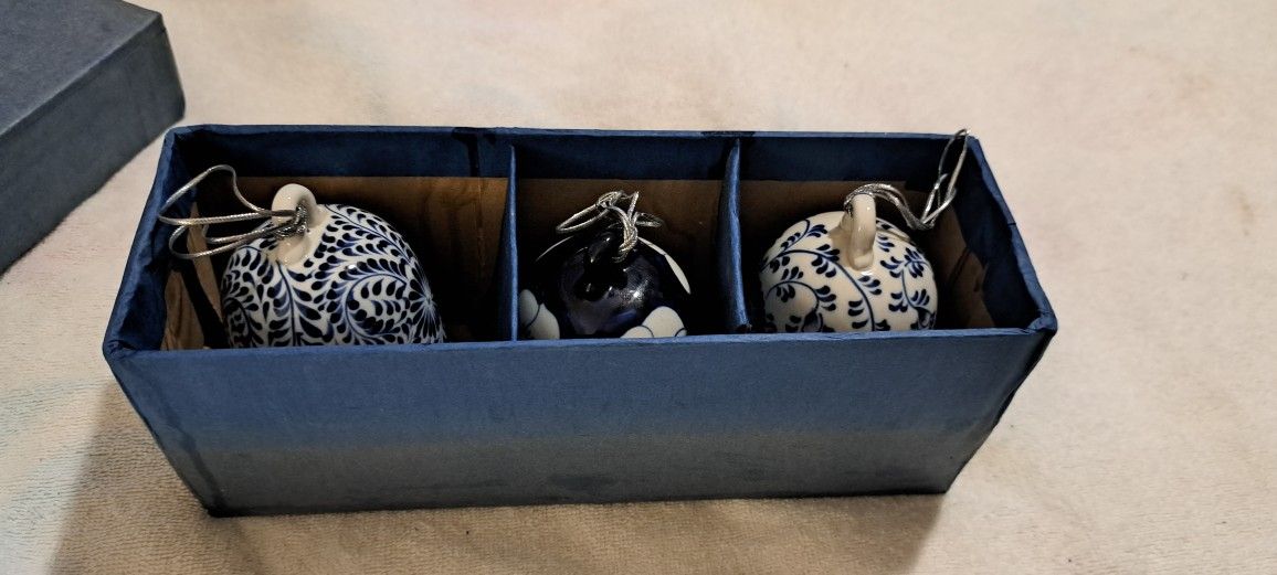 Vintage white and blue ceramic bells. Package of three. Never used. For decoration or ornaments.