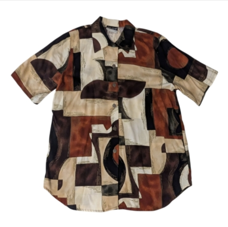 Vintage 80s Retro Caliche' Multicolored Abstract Design Button Front Collared Short Sleeve Blouse Top Shirt USA Women's Medium Elevate Your Style With This Abstract Pattern Women's Shirt. Its Unique Abstract Design Ensures You Stand Out In The Crowd. FEATURES •Brand: Caliche' Collection •STYLE: 10188 •CUT: 48642 •Vintage 80s Retro •Brown, Rust, Cream, Tan, Black, Charcoal (Or Very Dark Green?) •Abstract Geometric Print •Full Button Front •Collared •Short Sleeve •Metal Buttons •1 Spare Button •Blouse Top Shirt •Made In The USA •Women's Medium •100% Rayon •Machine Washable Approximate Measurements Taken With Item Lying Flat And Unstretched Shoulder To Shoulder: 17" Armpit To Armpit: 22.5" Sleeve Length From Shoulder Seam: 12" Overall Length From Shoulder: 30.5" Pristine Pre-owned Vintage Condition. Mother Is The Original Owner. She Only Wore A Couple Of Times. No Rips, Stains Or Fading. From Smoke Free Household. Cash And Pickup Only