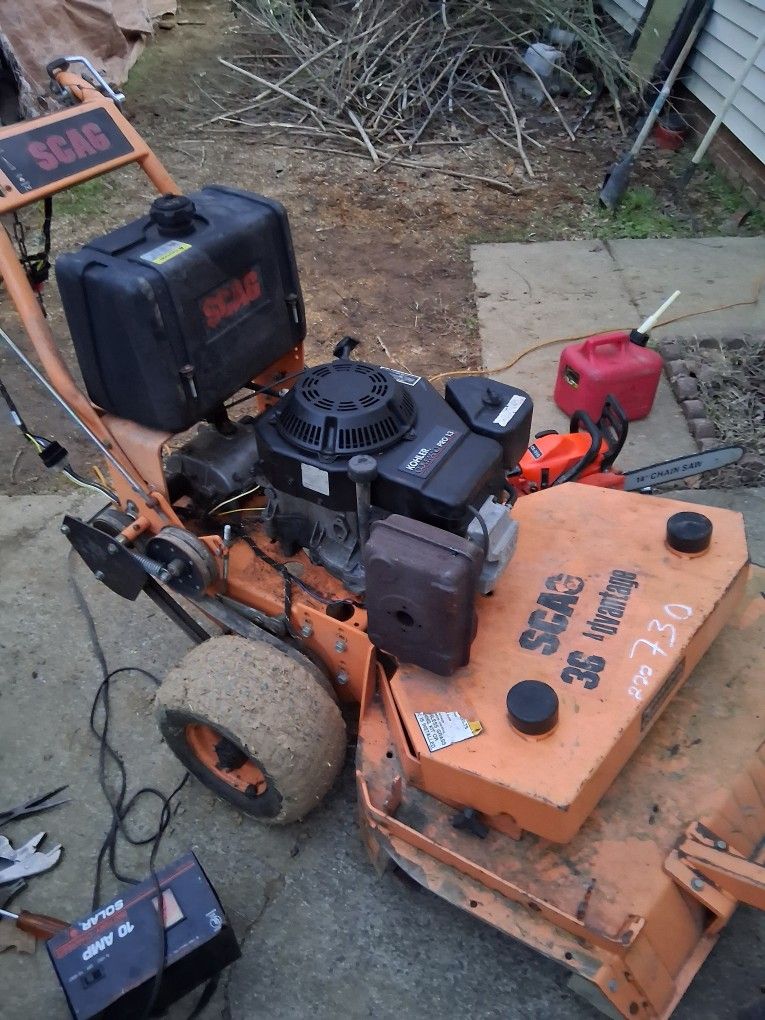 I have a SCAG 36 inch wak behind for sale..Starts,Runs,Drives..PTO doesn't engage.Something electrical.I just don't have the time for it.400 (Negotiable).I will even throw in a Troy bilt tractor/mower also..