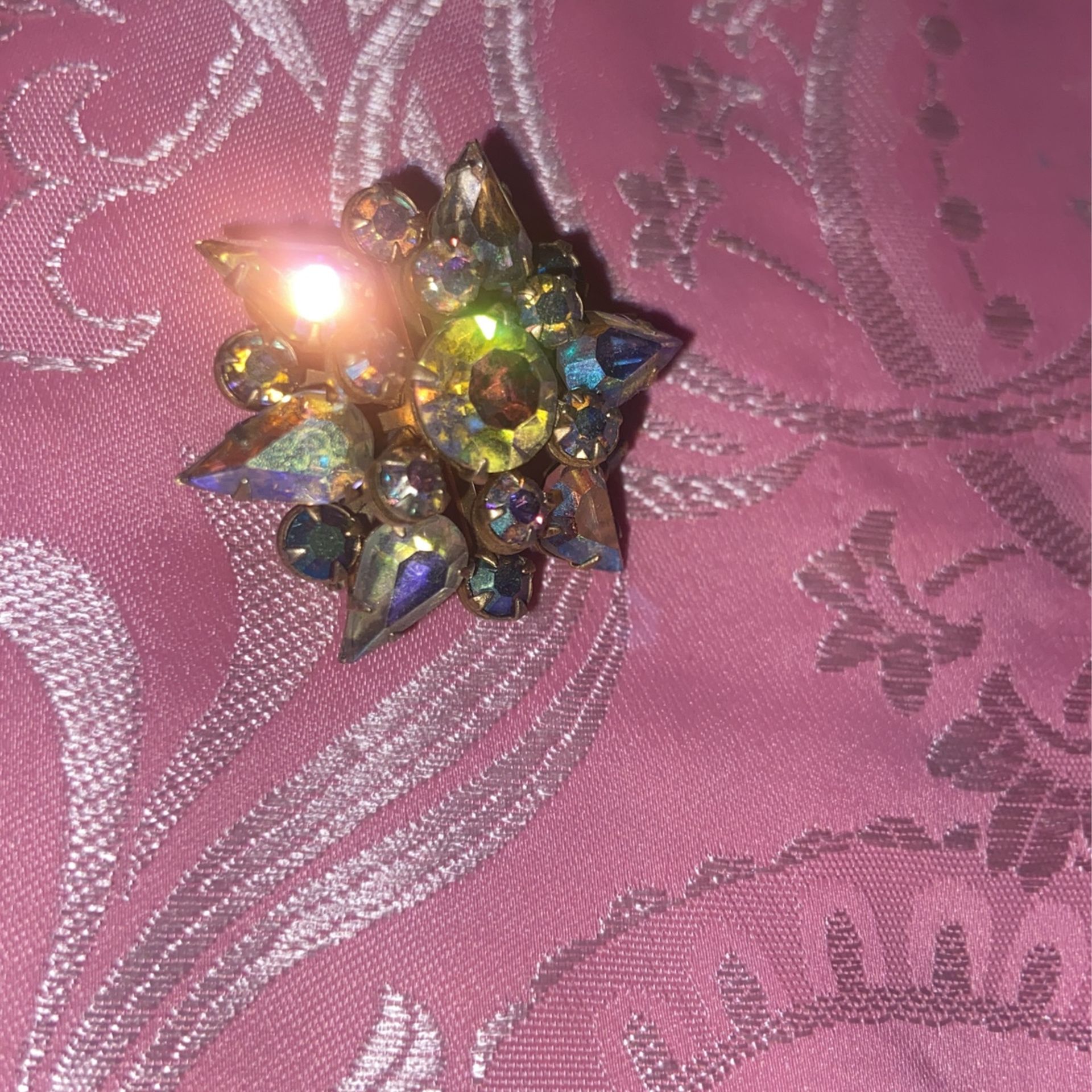 Vintage AB crystal rhinestone star brooch pin features stunning prong set faceted AB crystal rhinestones that sparkle with fire and brilliance.