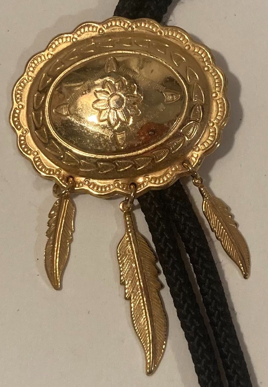 Vintage Metal Bolo Tie, Nice Brass Design with Gold Feathers, Nice Western Design, 3" x 1 3/4", Quality, Heavy Duty, Made in USA, Country & Western, C