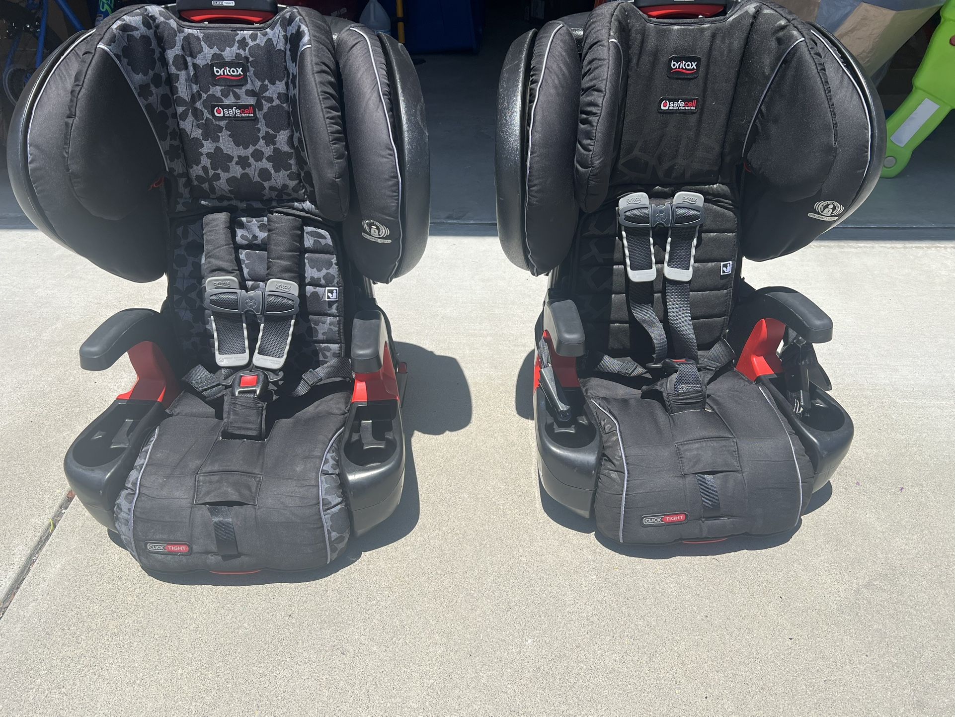 Great condition. These car seats have never been in an accident or even a fender bender. These seats have not reached their expiration dates (summer of 2027). They are comfortable enough for my kids to fall asleep in them. There are some white markings in spots which is from mineral based sunscreen. All the fabric parts are removable and washable and have been washed since my kids last used them. They come with mats that help protect your car from crumbs and spills. $120 each or $230 for both. From the manufacturer: This booster seat features the patented Britax SafeCell Impact Protection system which includes a steel frame, energy-absorbing base, V-shaped tether to minimize seat rotation and staged-release stitches that slow and reduce forward movement in the event of a crash. Britax designed the Pinnacle ClickTight Seat with three strong layers of side energy absorption. Seat can be used in Harness Mode for children 2 years old and 25 to 90 lbs. or in Booster Mode for children 40 to 120 lbs. Child standing height using the harness 30-58” and using booster mode 45-62”.