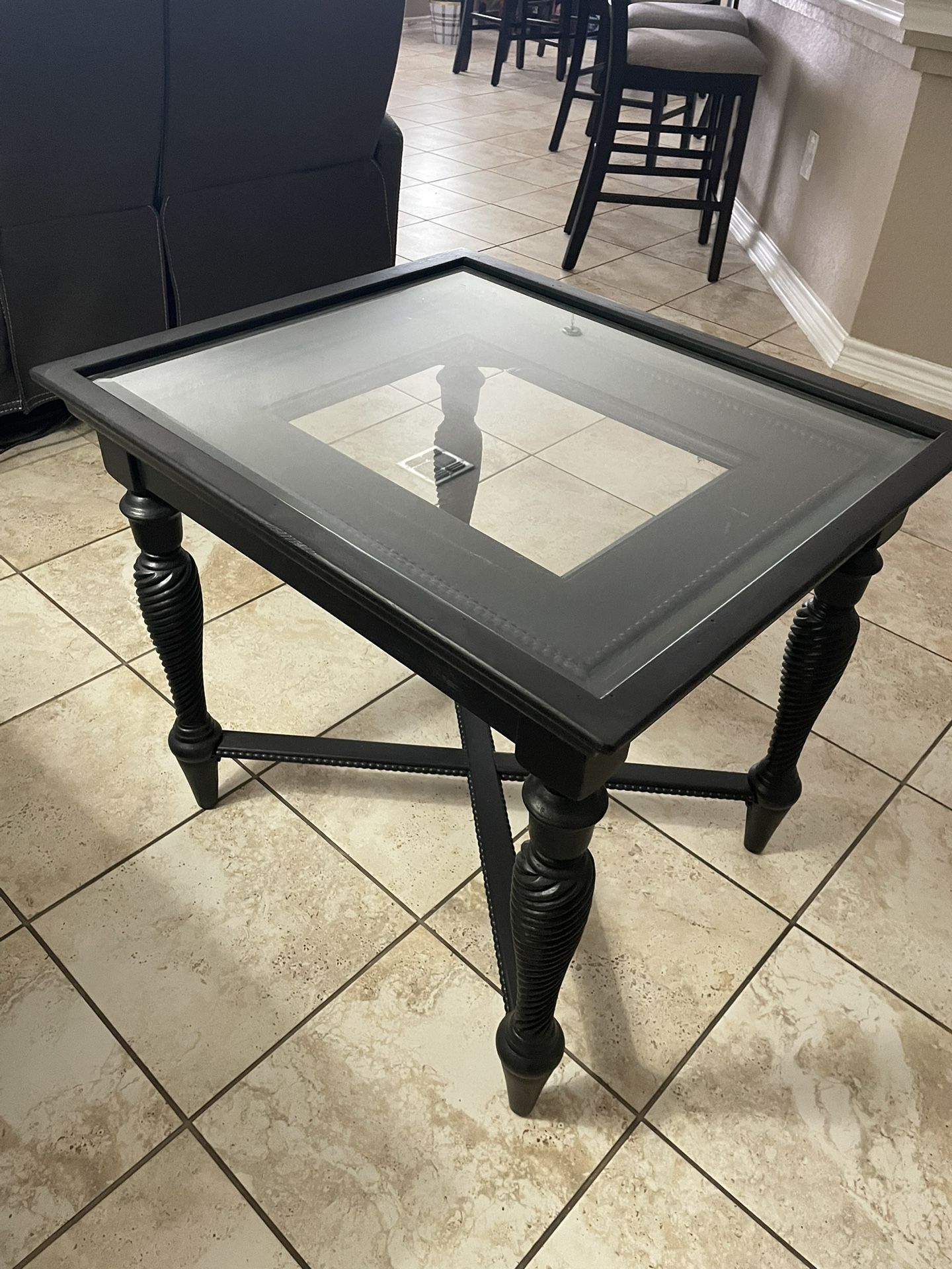 24”x28”. And 25” Tall. Black wood glass top end table. I’m in Universal City.