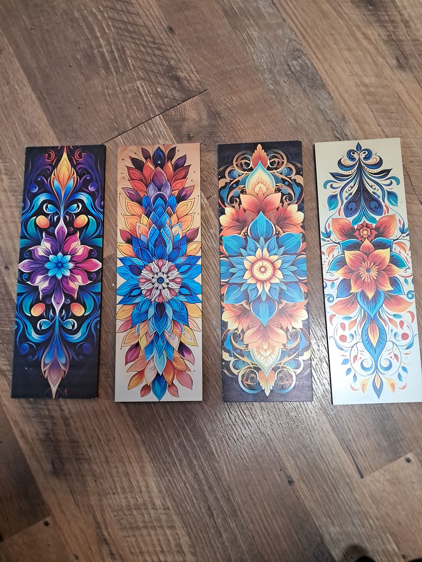 Boho chic wall pictures. 4 pictures in all. Colorful bright and beautiful. Each picture is 6 inches tall and 4 inches wide. 4 piece set $10