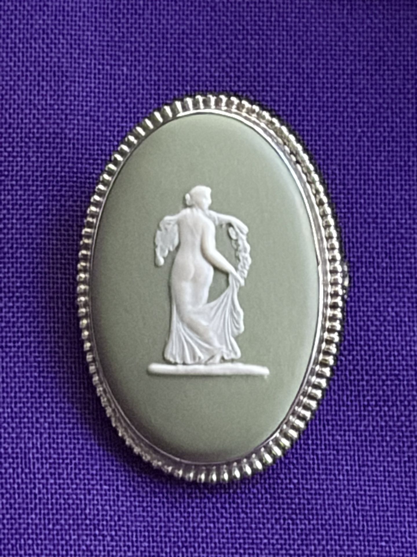 Vintage Wedgwood Jasperware sage green and white cameo brooch featuring a classical figure, often identified as a Floral Girl or part of the "Dancing