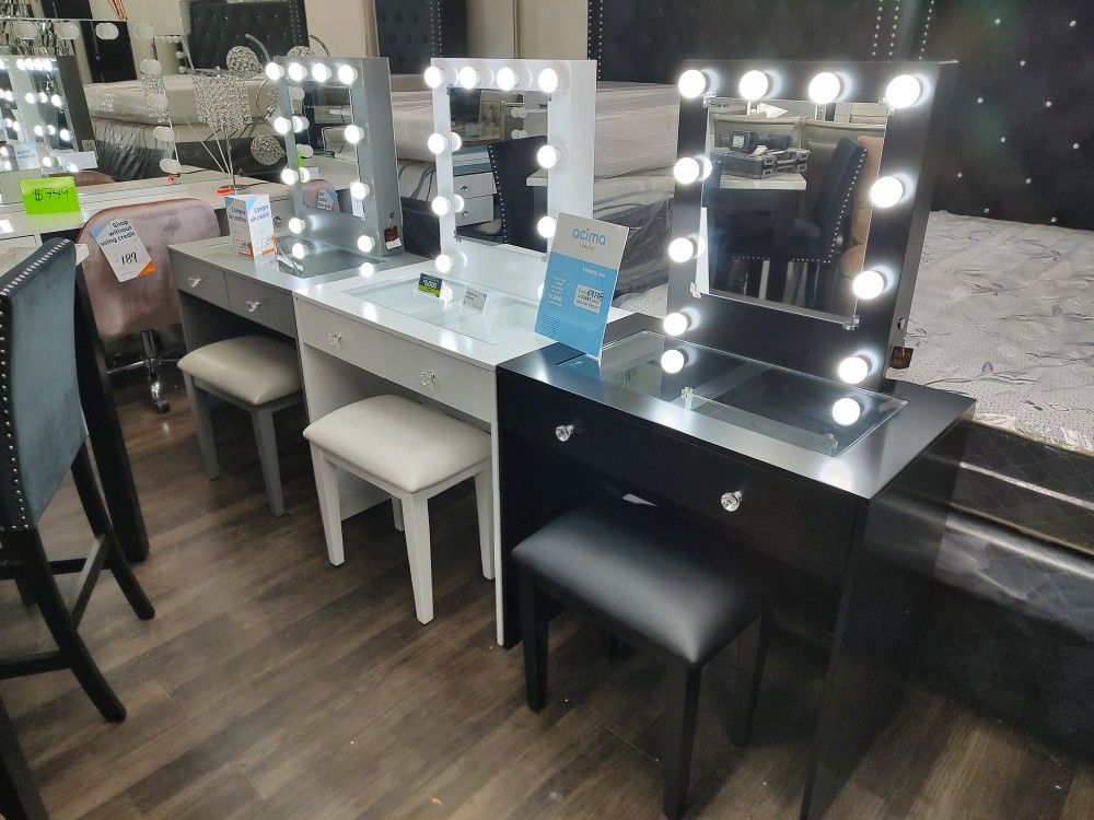 Brand New Vanity Solid Wood Grey, Black Or White Hollywood Mirror Light Builbs LED W/ Adjustable Brightness Touch Up Sencor 2 Drawers USB & Power Outlet Stool Included $389 + TAx Elis Furn Finance Available 3 Months Same As Cash Open 11 to 7 everyday