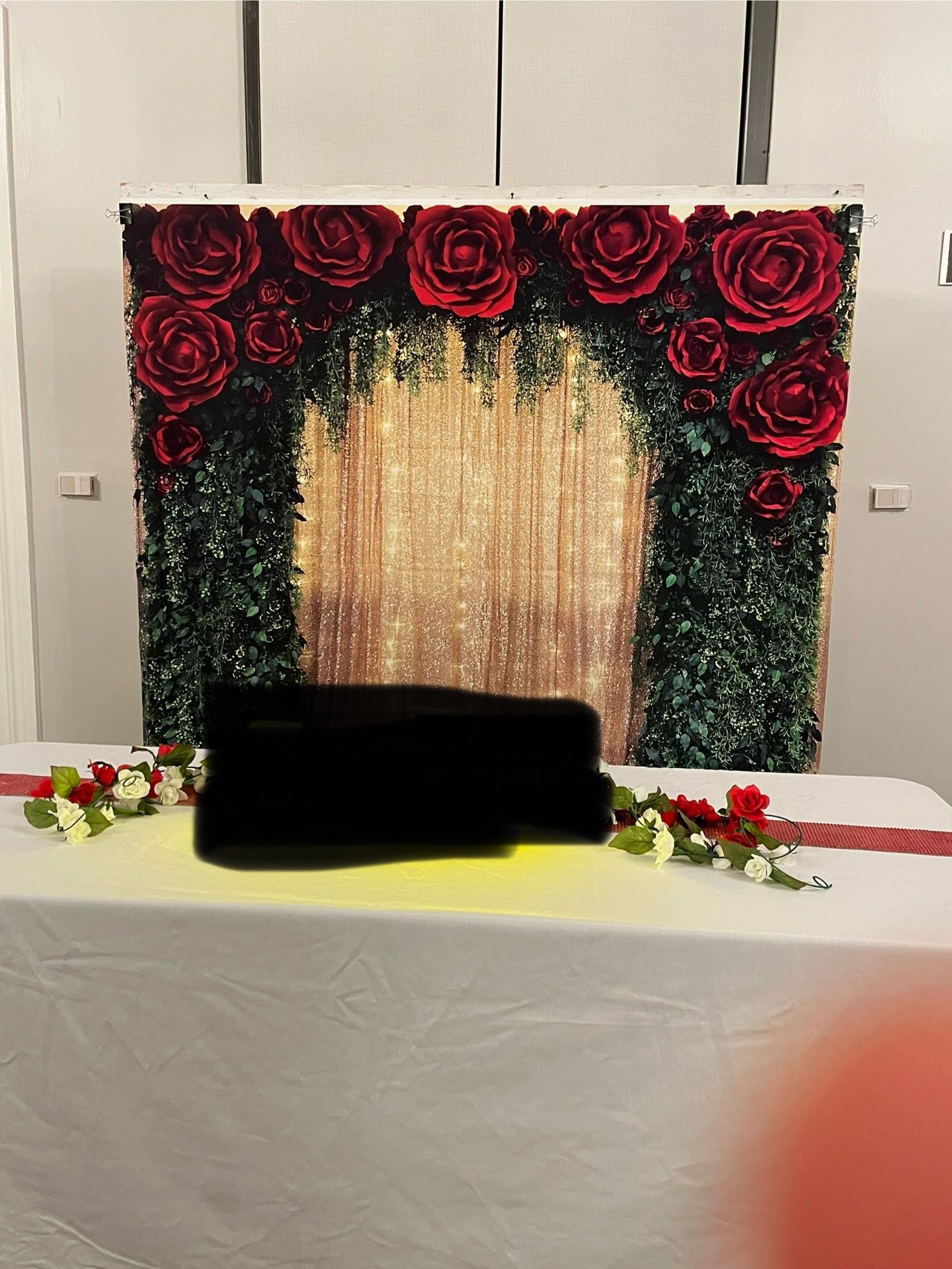 Telón de fondo de boda con purpurina dorada de 7 x 5 pies, pancarta de hojas verdes y rosas rojas, para arco de boda, fondo de fotografía para decoración de fiestas.