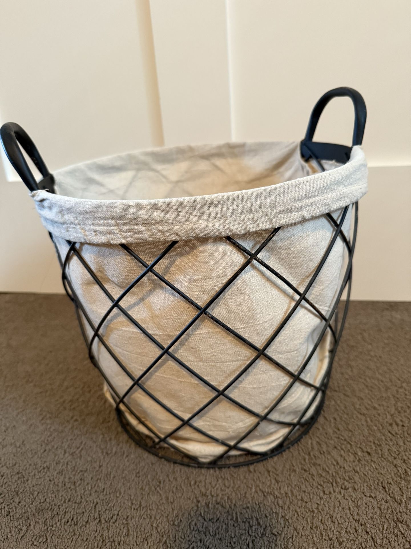 Metal basket with canvas inlay 11 inches high 12 inch diameter Used to hold a couple of blankets