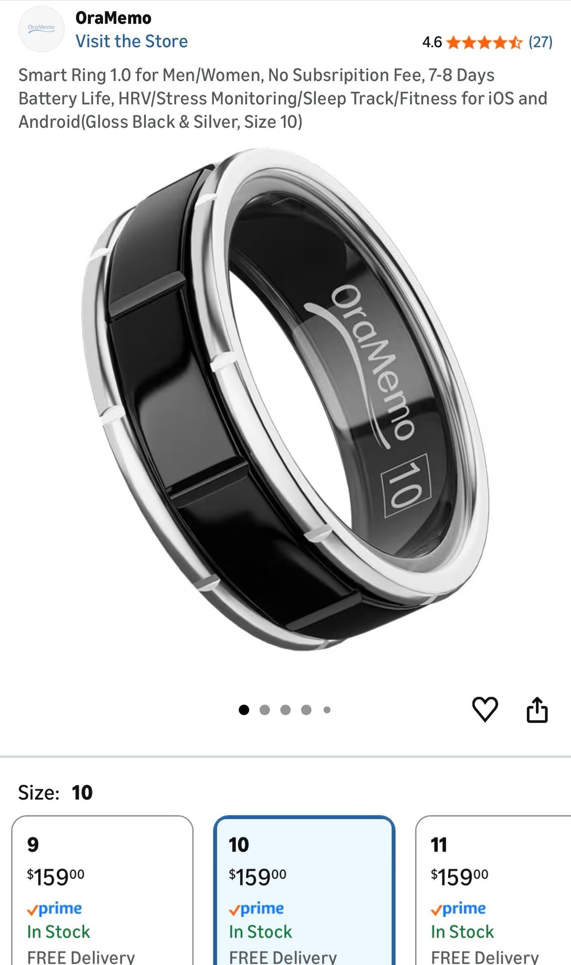 Bought for my wife, she doesn’t like it. Only tried on to see if she liked it. The size 10 seems more like a size 9. * [Precise Fit, Measure First] OraMemo adopts a proprietary sizing system, distinct from standard ring sizes. Pair your OraMemo Smart Ring with our OraMemo Smart Sizing Kit to measure your finger accurately, ensuring a perfectly comfortable and secure fit—no more "too loose" or "too tight" hassles. * [OraMemo AI Health Insight] OraMemo Smart Health Ring integrates AI-powered multi-sensor fusion technology to continuously monitor core health metrics such as sleep quality, heart rate variability, stress levels, blood oxygen saturation, physical activity, and menstrual cycles. Its built-in AI health assistant leverages deep learning analysis to deliver personalized health reports and actionable insights, empowering you to optimize wellness and daily habits with scientific precision. * [No Subscription, Permanent Feature Access] At OraMemo, we believe in "hardware as a service": purchase your OraMemo Smart Ring and enjoy lifetime access to all standard features on the OraMemo Smart Health App. No recurring fees—just continuous real-time health tracking, AI-powered insights, and personalized guidance, always at your fingertips. * [7-8 Days Long-Lasting Battery] A single 60-minute fast charge powers OraMemo for up to 7-8 days of uninterrupted use. Say goodbye to constant recharging—whether you’re traveling, working overtime, or exploring outdoors, keep your health tracking consistent and comprehensive, no matter how busy life gets. * [All-Scenario Waterproofing] OraMemo is IP68-rated (tested to 100m/328ft depth), making it resilient against daily splashes, showers, rain, and even swimming, surfing, or diving. Its fully sealed, durable structure repels water intrusion, ensuring reliable performance season after season.