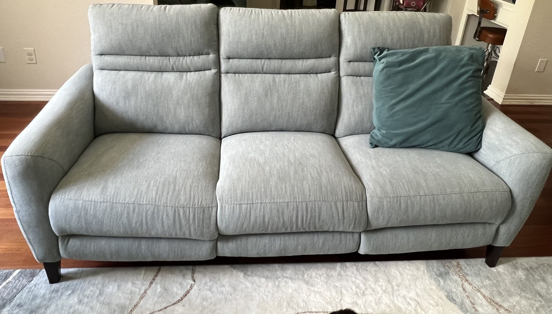 Light blue fabric. Less than two years old. Barely used. Power recliners on both ends.