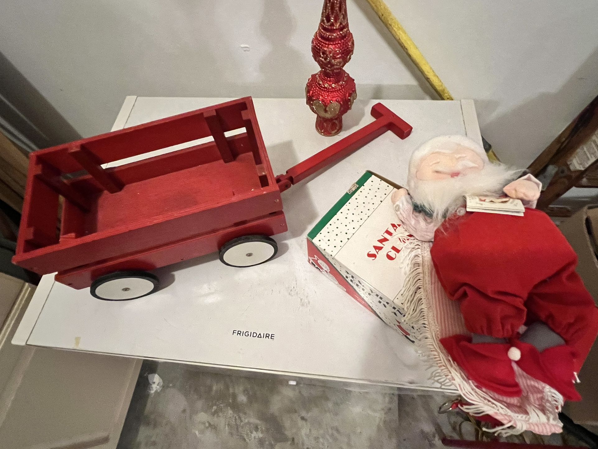 Knitted Beanie Tree Topper $3 ; Musical Moving Sleeping Santa on a Hammock $5; Red Wagon $4; Red & Gold Tree Topper Cone $2; . All for $12