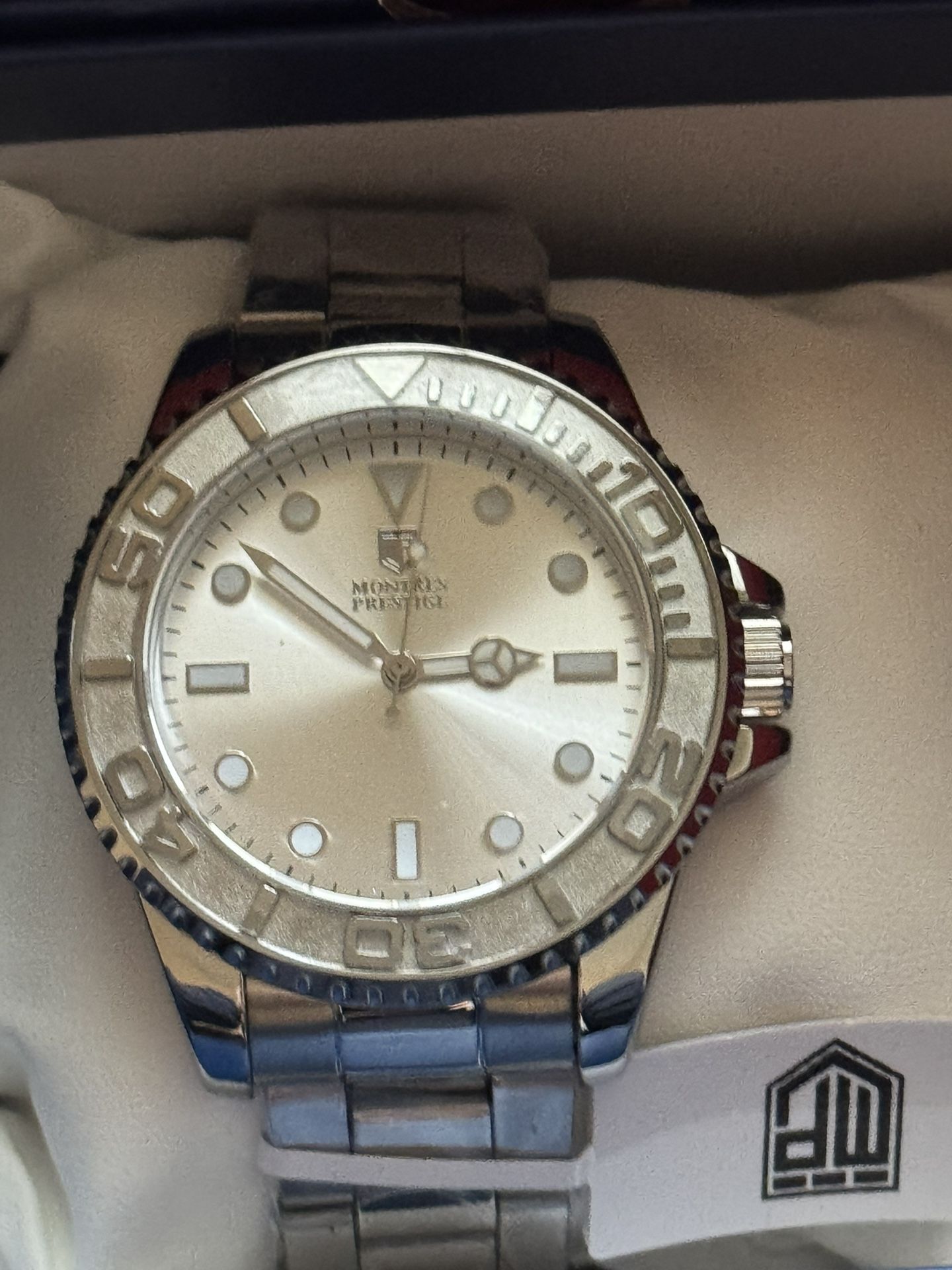 Watch is brand new comes with original box, tags, and factory plastic protectors on watch. This impressive Montres Prestige watch features a precise Quartz movement as well as a steel case. Its white, copper dial is enclosed by a highly protective Flame Fusion Crystal. This watch is finished by a strong steel, band, and it offers 30 m water resistance