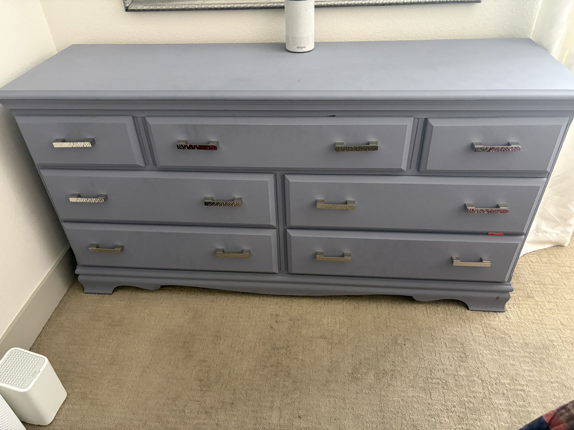 Solid wood with new hardware. Blue gray color. In great shape. Moving.