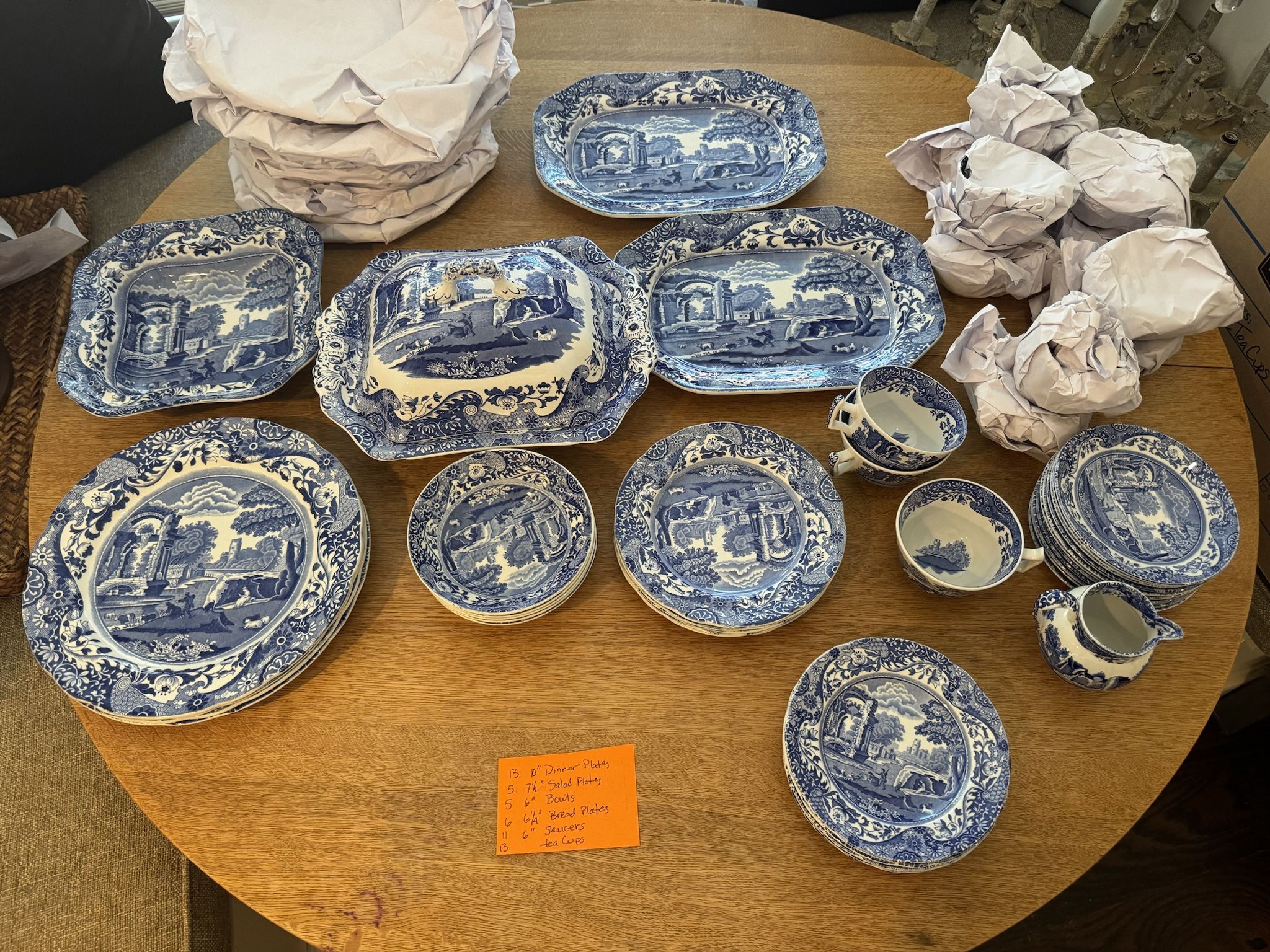 Set of antique 19th century Copeland Spode blue and white transfer china with Italian landscape. Includes (13) 10” dinner plates, (13) cups and (11) saucers, (5)salad plates, (6)bread plates, (2)rectangular serving dishes, 1 lidded serving bowl, creamer, and round serving bowl. Good condition - minor crazing does not detract. Various stamped and impressed marks on the back. A beautiful set ready for use.