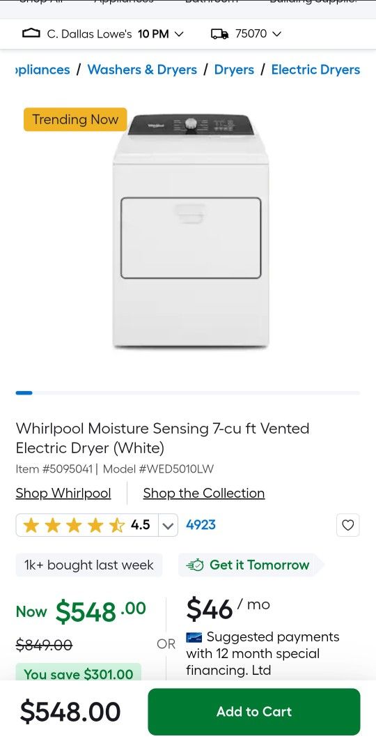 7.0 Cu.ft whirlpool electric dryer, ready for new home.