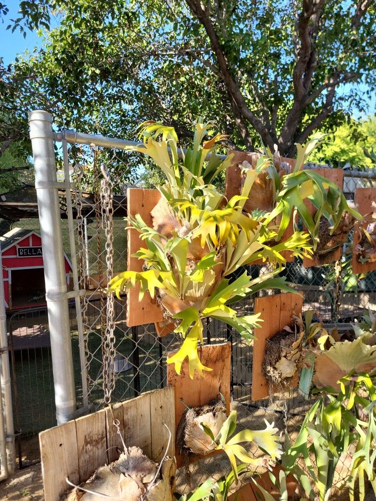 Staghorn ferns available different sizes and styles available $25 to $150 each, depending on size.