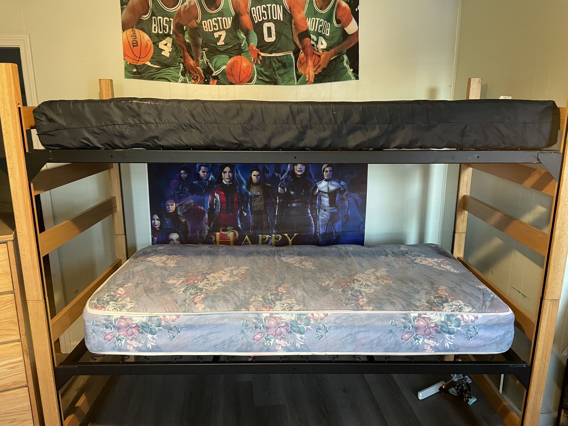 These bunk beds are made of solid wood with metal box springs so the kids will never break them! They are extended length so the taller kids will fit fine. Comes with 1 bureau and all in great shape. Need gone asap