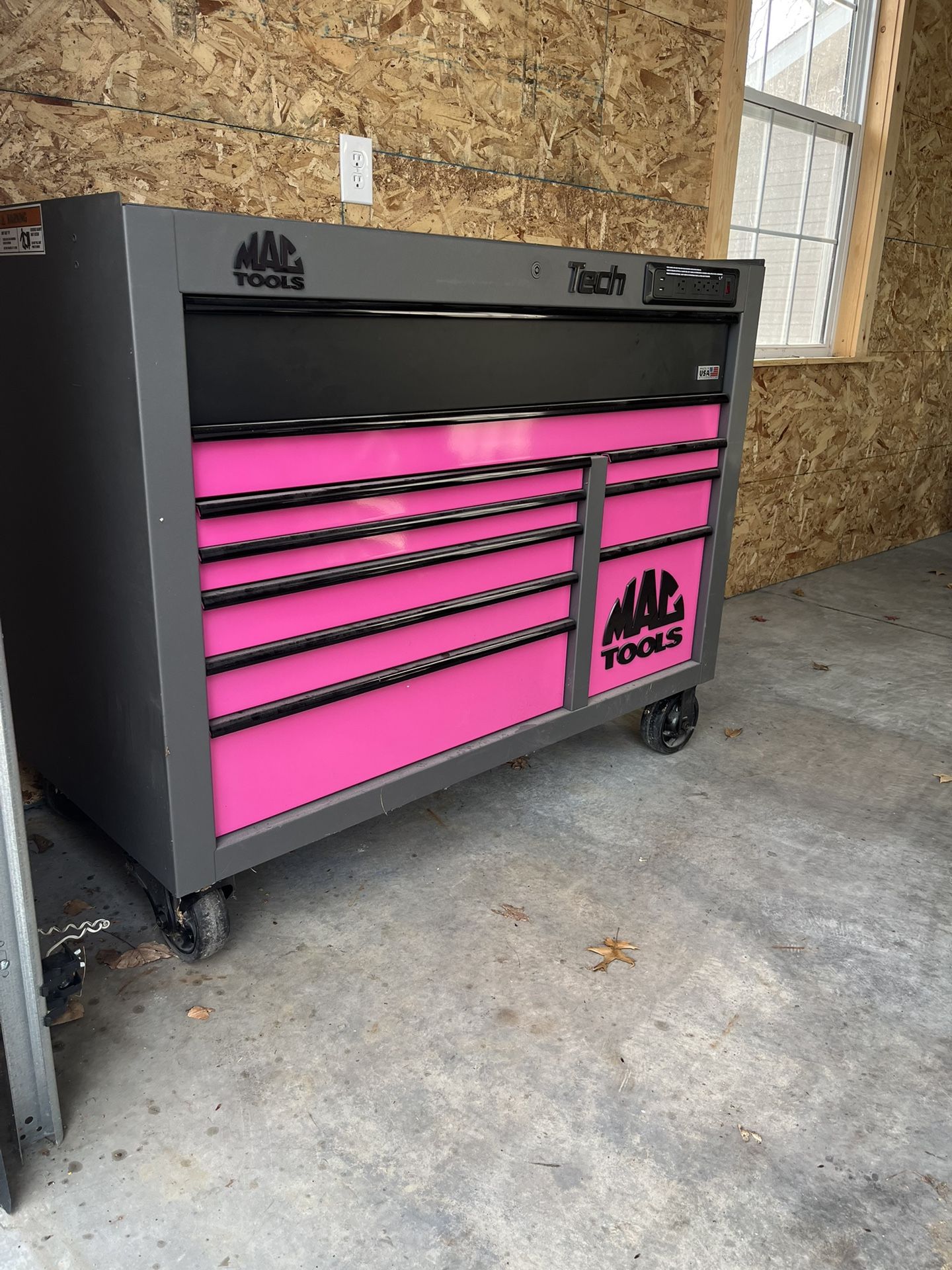 MacToolbox 50” never used- brand new condition. Accessories are sill in bags. This is a very nice tool box with a custom ordered paint combo. Charcoal/black/pink.