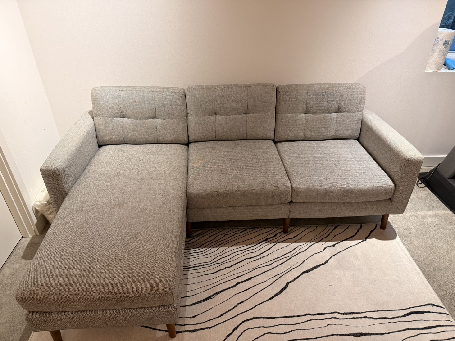 Convertible sofa, can be either 3 seater or with a chaise. Color is crushed gravel with walnut legs. Pet household.