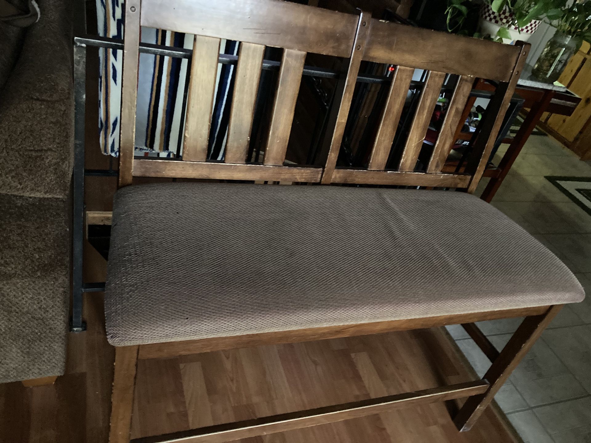 This wood bench can sit at a tall table. Very sturdy. Non smoker