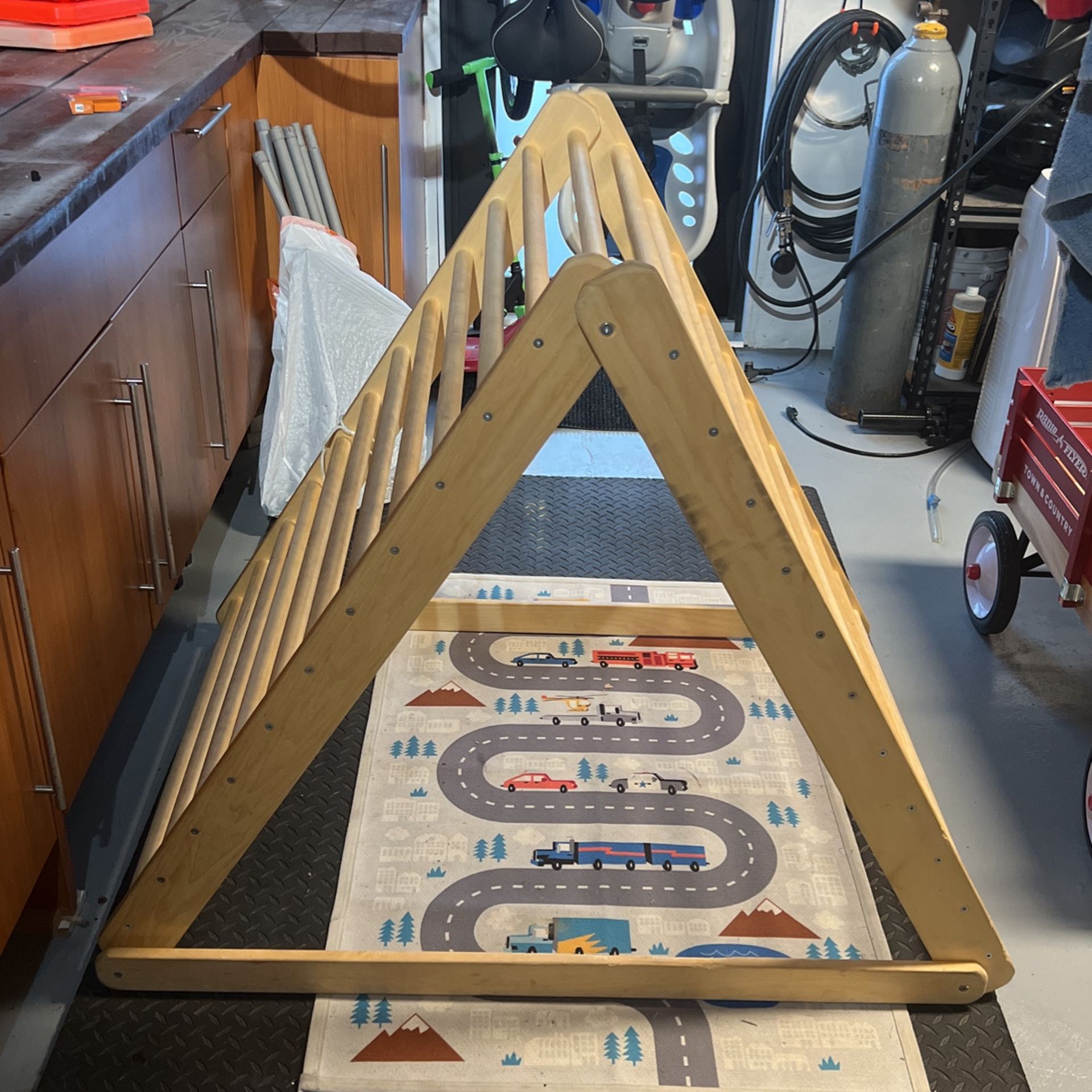 Large Wooden pikler triangle. Has some slight marks that need to be sanded. Strong quality wood, also folds completely flat. 3ft 3.5in tall 2ft 9 inches wide 4ft base length