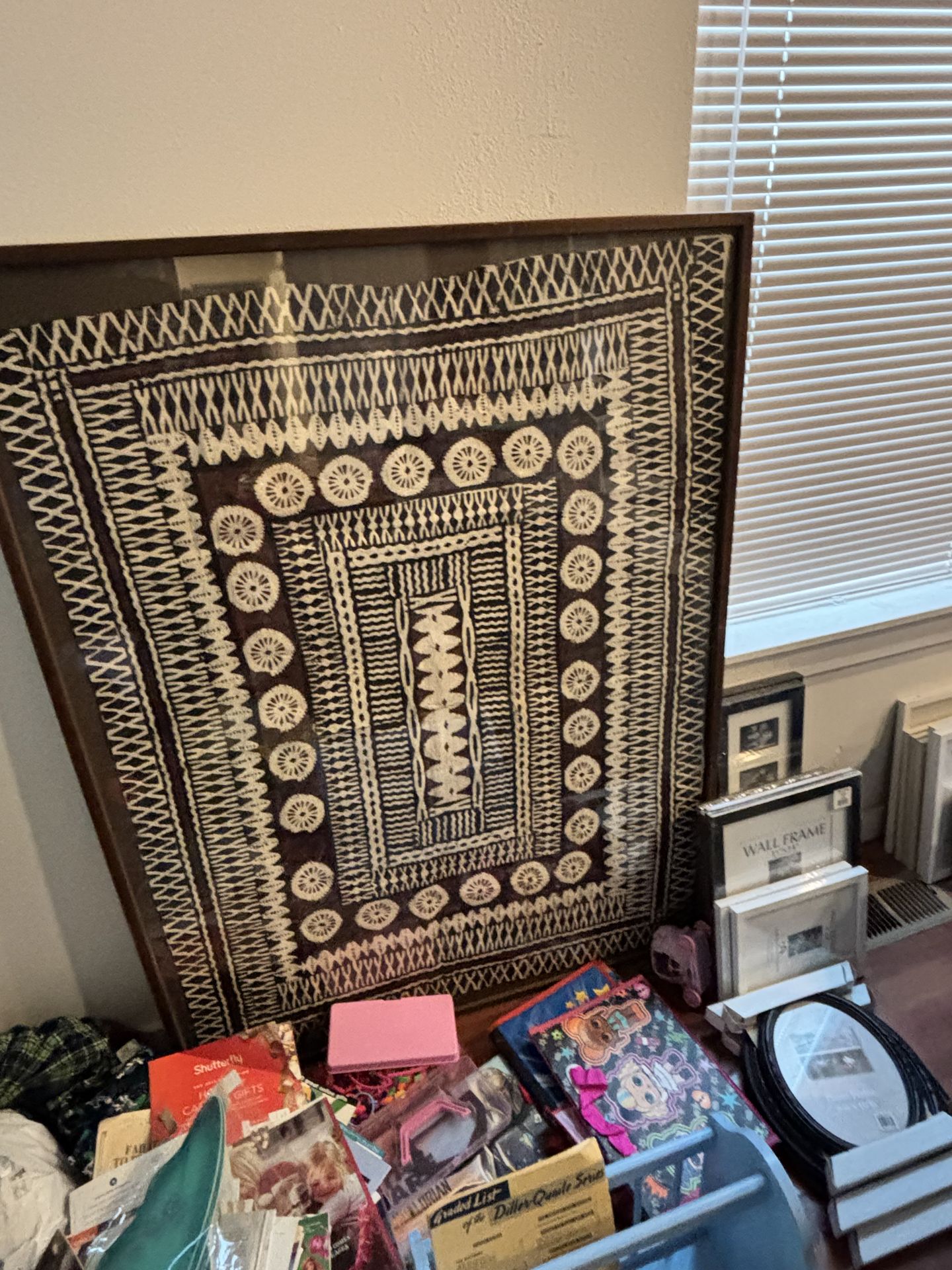 Nice frame piece of tap bar cloth Vintage. It’s in good shape. Nicely framed.