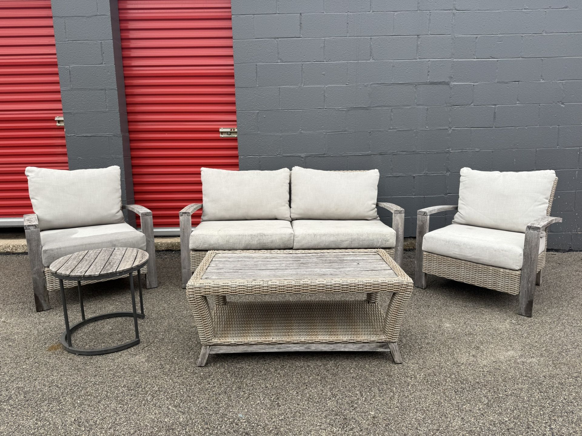 Outdoor 5-Piece Patio Set β Free Curbside Delivery Beautiful outdoor patio set with a clean modern coastal look. Woven wicker and light gray cushions that fit perfectly on a patio, deck, balcony, or backyard setup. Includes loveseat, two armchairs, rectangular coffee table, and round side table. There is visible wear and cracking on parts of the wooden armrests from outdoor exposure (shown in photos). Cushions do have some staining from being outside, but they can be cleaned with a power wash. Set is still solid and ready to use. Get $50 off if you pick up (Zip Code: 60101). Need help inside? We got you (small fee). π Same-day delivery π‘ From a Smoke-Free Home Payment options: Venmo, CashApp, Apple Pay, Zelle, or Cash.