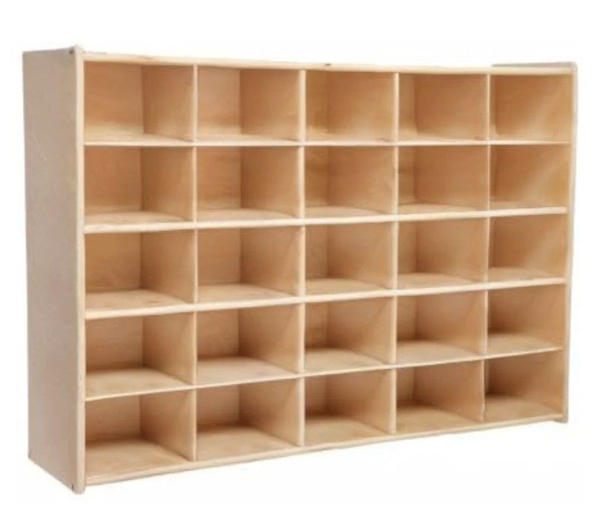 This offering includes a NEW, never unboxed 25-compartment cubby. It was purchased for a kindergarten team of teachers but it wouldn't fit into the space. In original boxes - ready to put together. Heavy! There are 2 identical boxed cubbies available. If interested in both, we can discuss reducing the price. This item has to be picked up in the 78727 area. Full Description: Color: Natural Material: Birch Plywood Product Dimensions: 46.75"L x 12"W x 33.88"H Brand: Contender Finish Type: Natural Manufacturer: Wood Designs Co. Weight : 67.6 pounds Model number : C16009 PERFECT ORGANIZER: Now easily organize your kids toy, art and craft supplies, tools and hardware with this 25-compartment shelving unit. It does NOT come with trays/containers. EASY TO REACH : This classic birch hardwood cabinet is a perfect fit for classroom, kindergarten, daycare, homeschool, garage area, maker space, etc EASY TO CLEAN : This stylish organizer is coated with exclusive Tuff Gloss UV finish making it easy to clean and resistant to stains. EASY TO ASSEMBLE: It comes with unique mortise, hex screws which makes it durable and is easy to assemble for any adult. Casters/wheels are available separately - selling 4/$20, if interested.