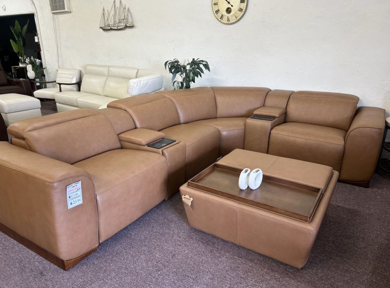 136” x 102” x 31 Retail price: $8,294 Smooth buttery leather with low profile look which gives this beautiful sectional a modern look while pairing it with maximum comfort dual recliners with switch panels located on the sides of the cushion and reclining headrest that not only support neck but gives the couch a whole new new look. The USB and Type C outlets, the cupholder and console with storage makes a go to choice for comfort and convenient. Delivery available Financing available Store display item