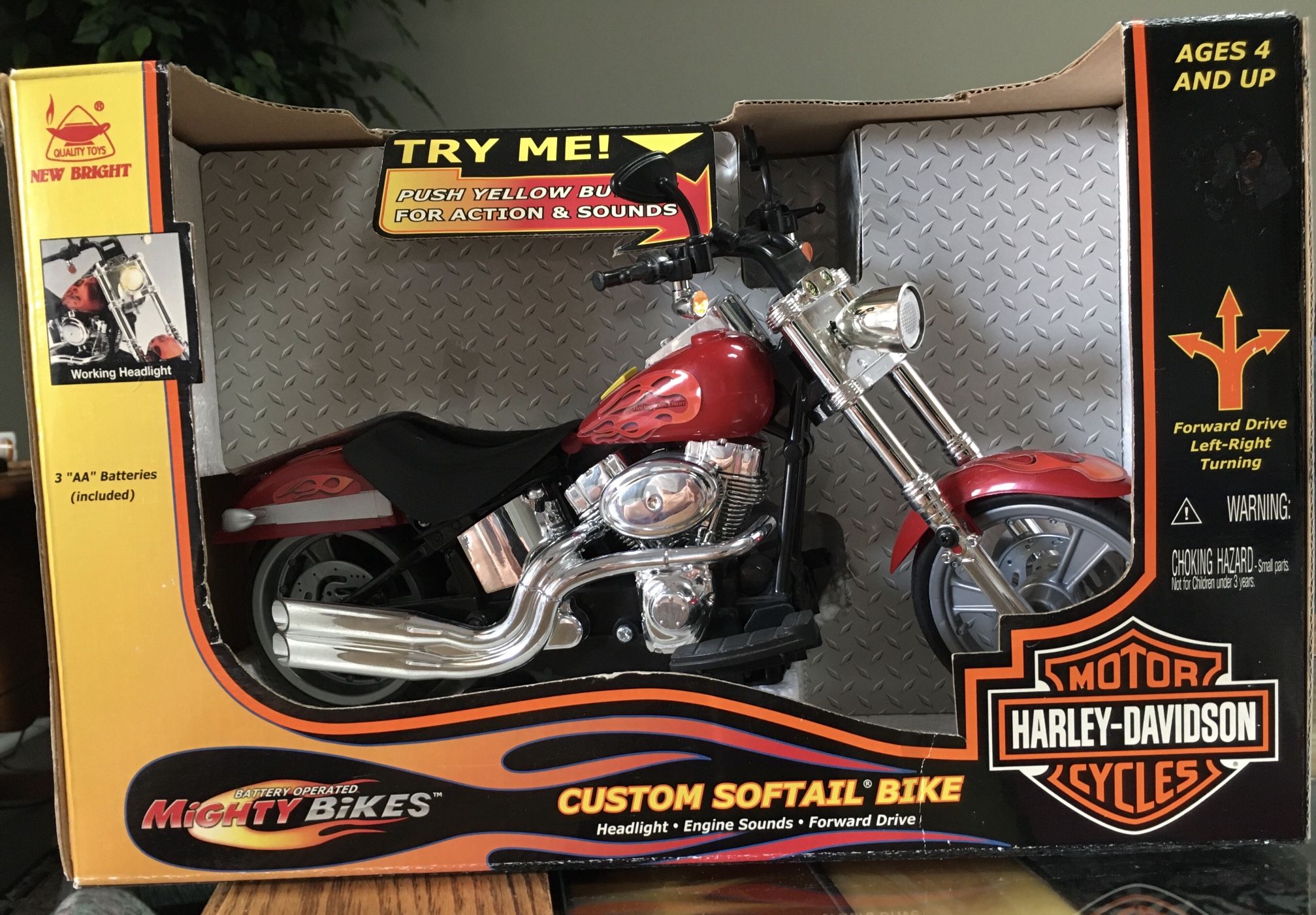 Harley-Davidson ‘Custom Softail’ Bike - size is 12“ x 4 1/2“ x 7 1/2“ high. - battery operated headlight, engine revving sound and forward drive. Left, straight ahead or right - In it’s original packaging – Great toy for a son of a “biker” - downsizing after a move. Must sell, along with many other items posted. – PRICE REDUCED - Cash sale only.