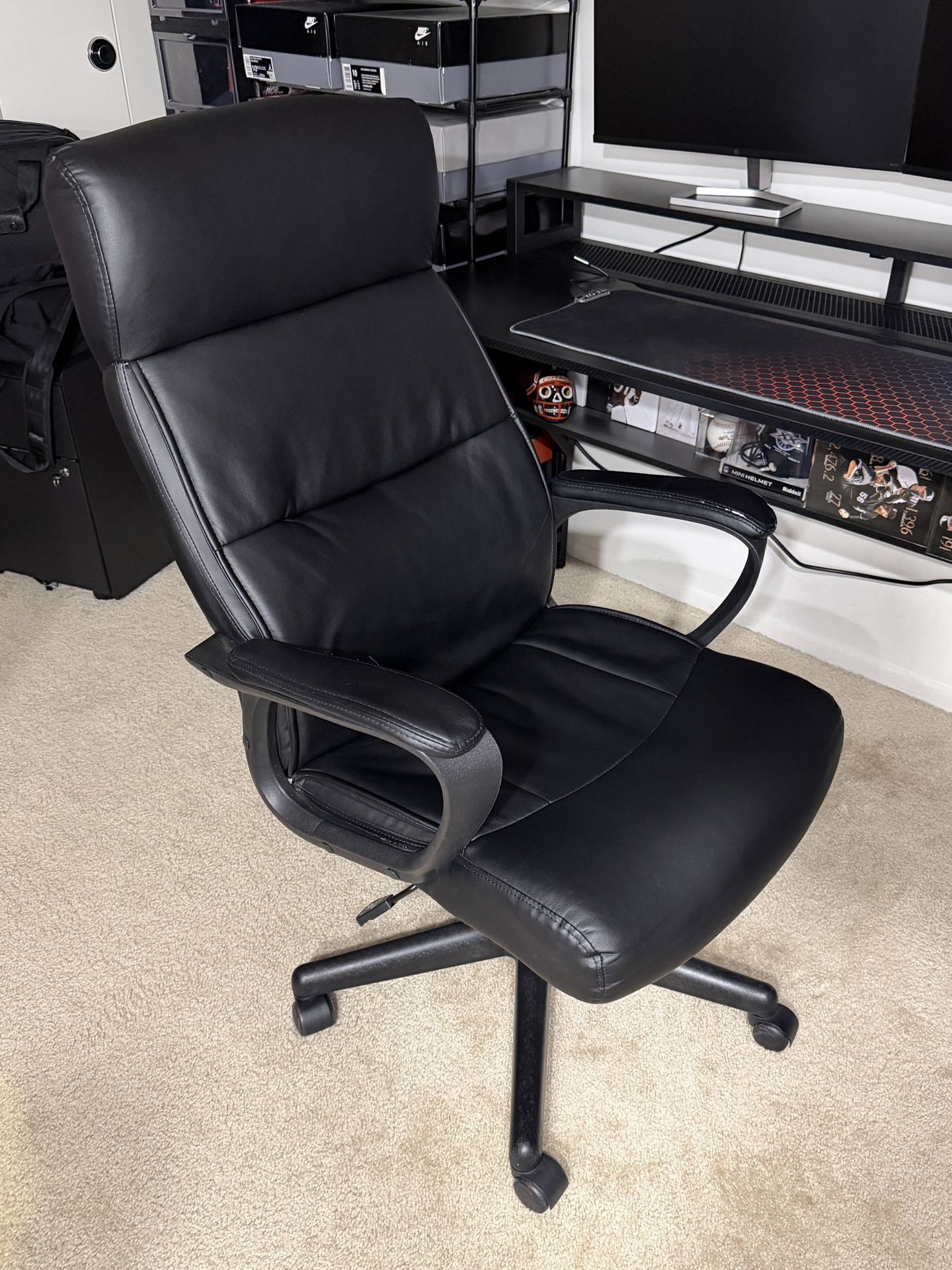 Office/computer desk chair made of faux leather. Has two adjustable options. Lever for seat to go up and down. Lever also allows back support to tilt back or lock into place. I am selling all of my office furniture because I am moving. Desk listed separately.