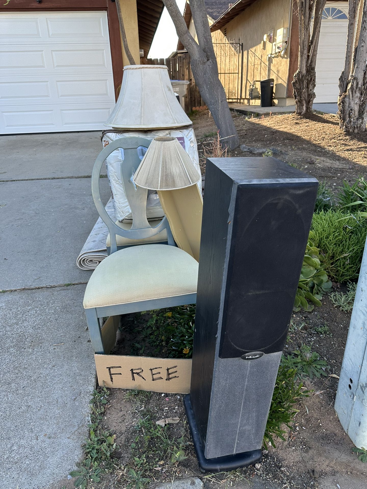 Free Misc home goods 2 Ethan Allen dining chairs 2 Polk audio floor speakers 8x10 area rug Decorative trunk or side table Lamp shades Cream color king size satin comforter needs to be washed Pick up in Mira Mesa will provide address to serious inquiries only.