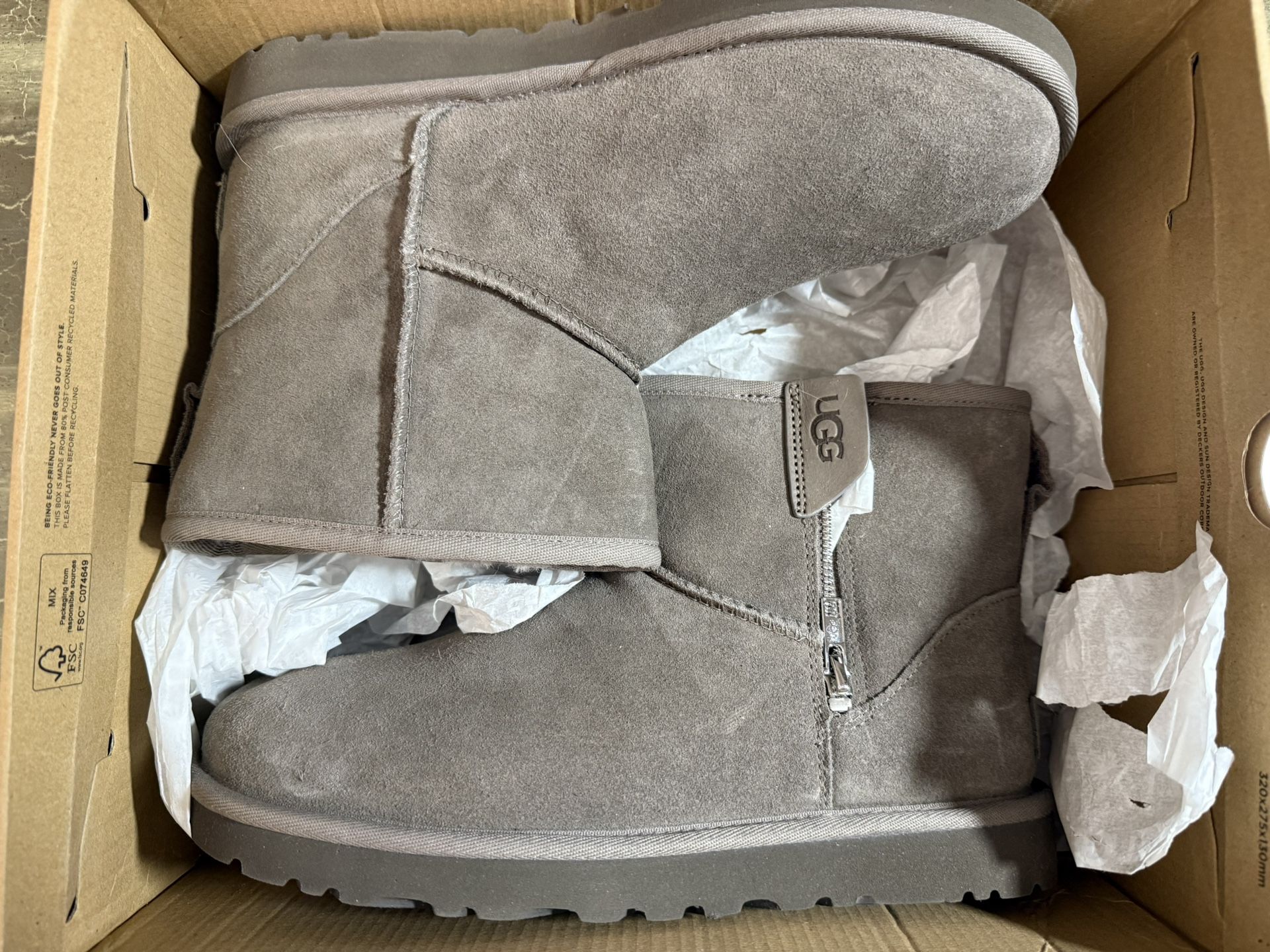 Brand new UGGs, they’re brown/grey in color. Never worn. Top of box missing