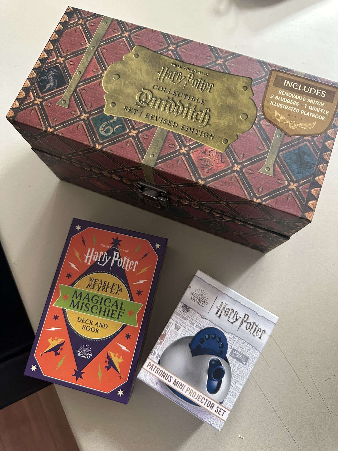 Harry Potter Collectible Quidditch Set - includes a removable snitch, 2 bludgers, 1 quaffle illustrated playbook Harry Potter Magical Mischief Deck and Book Harry Potter Patronus Mini Projector Set All items are brand new in unopened boxes