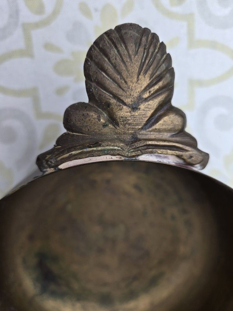 This bowl is from my grandmother's house. It has art-deco handles that might be hand etched from the various small differences in the design. It has some signs of age, like a pretty significant oxidized spot on the side ( see pictures). It is still a pretty interesting piece. Accepting reasonable offers.