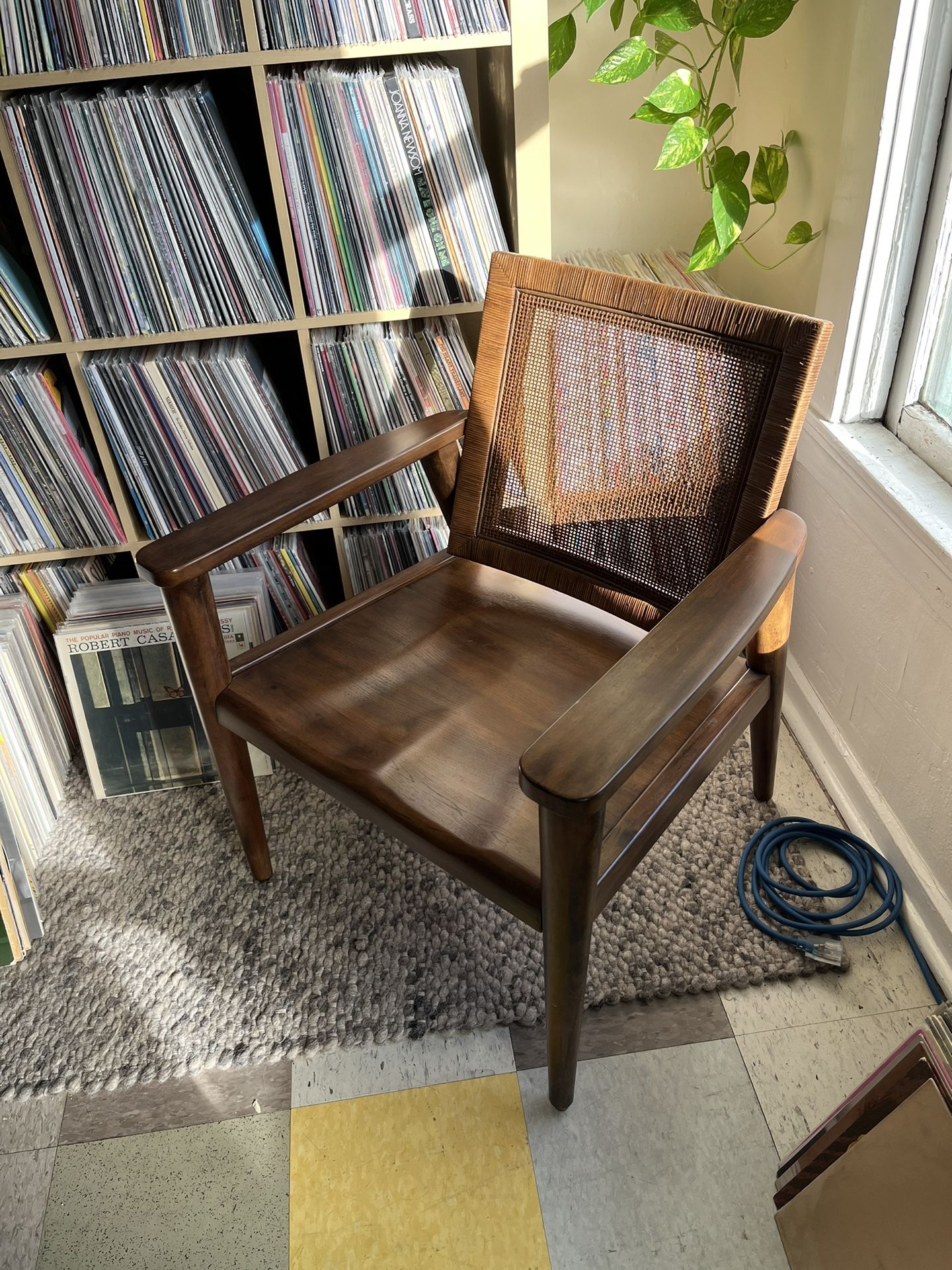 Big wooden and wicker reading chair. The back is 32” high and the arms, at their widest, are 27”. No idea what the brand is but the last photo is the designer’s stamp. It’s been a great chair but is too big for my new apartment… Has a couple scuffs that can be buffed out and the right arm rest has a small nick. I bought it last year for $150 and am just trying to get my money back