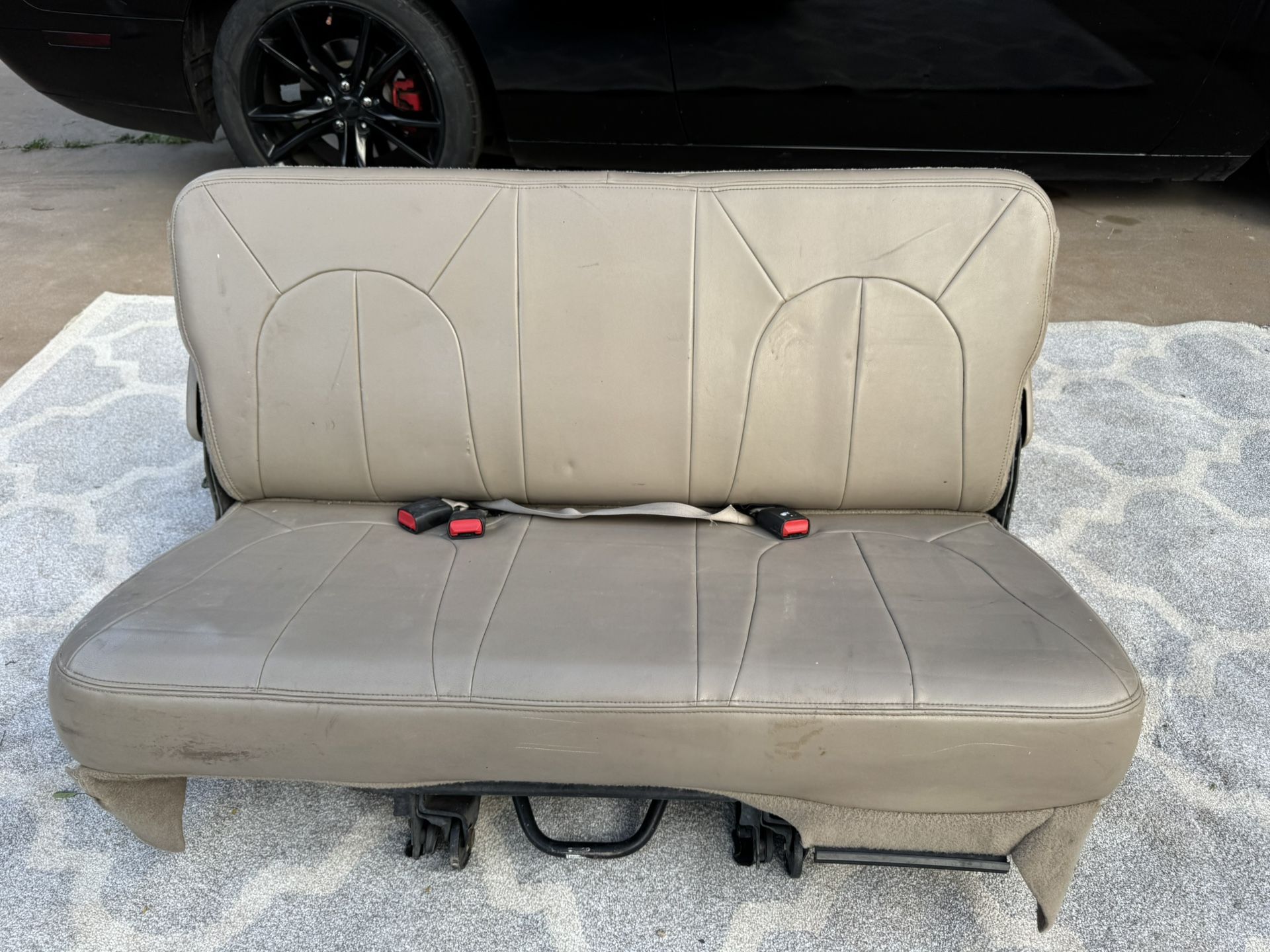 Rear bench seat removed from a Ford truck, likely from an F-150 or Ranger extended cab (late 90s–early 2000s). • Tan interior • Includes seat belts and mounting brackets • Folds forward • Good structure, normal wear from age • No rips or major damage Great for replacement, project truck, or custom build.