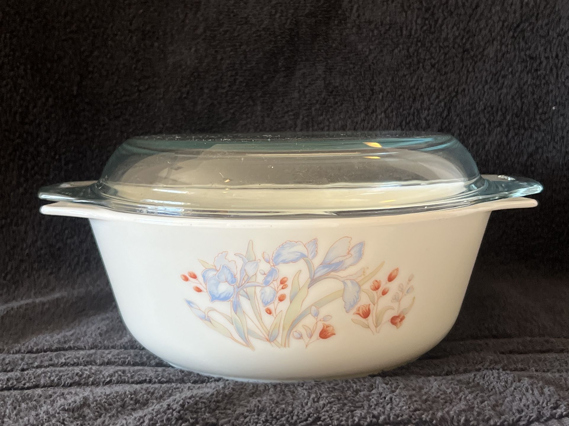 Vintage Pyrex England Blue Iris Round Casserole Dish With Original Lid & Tab Handles-Marked